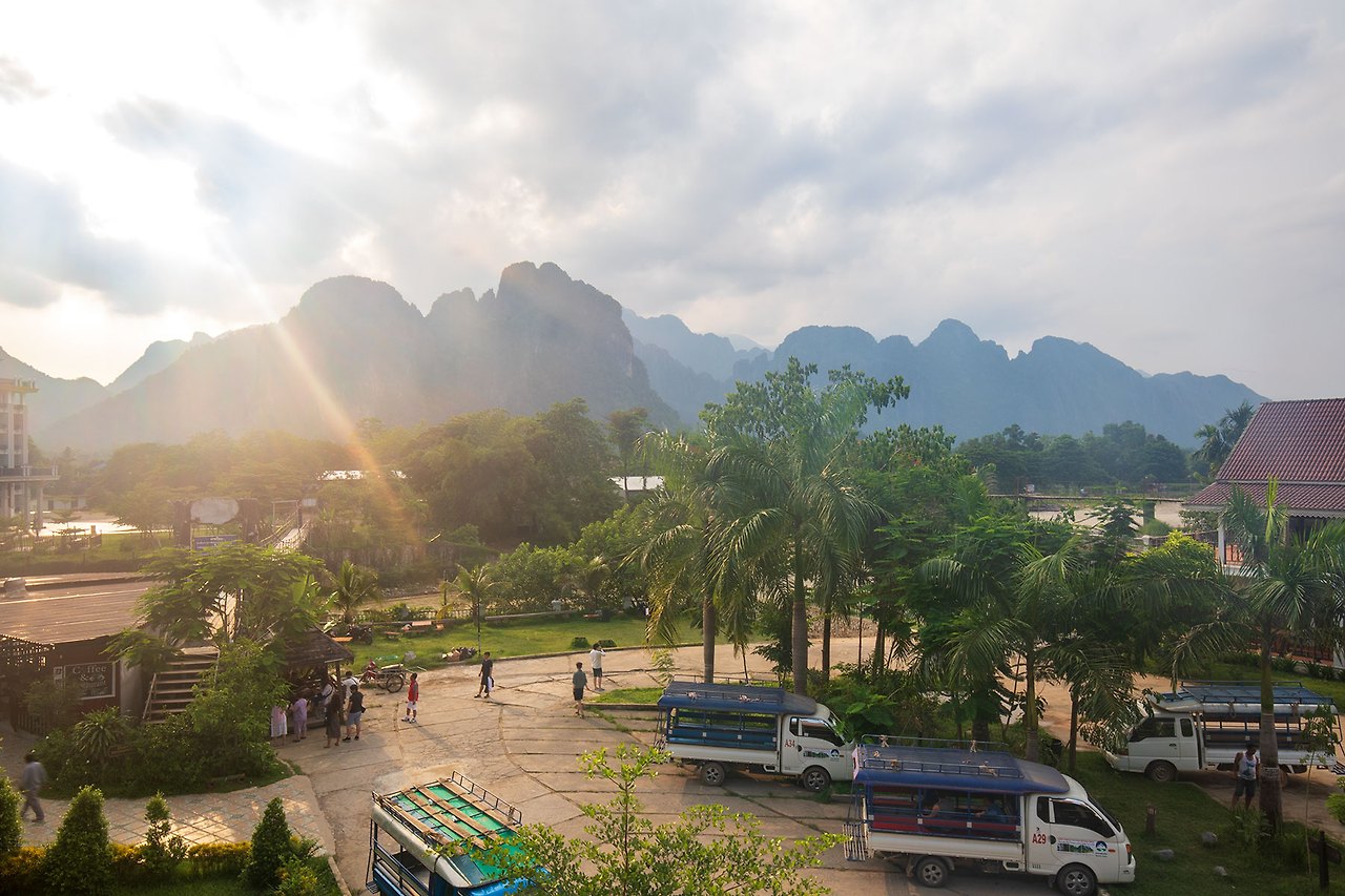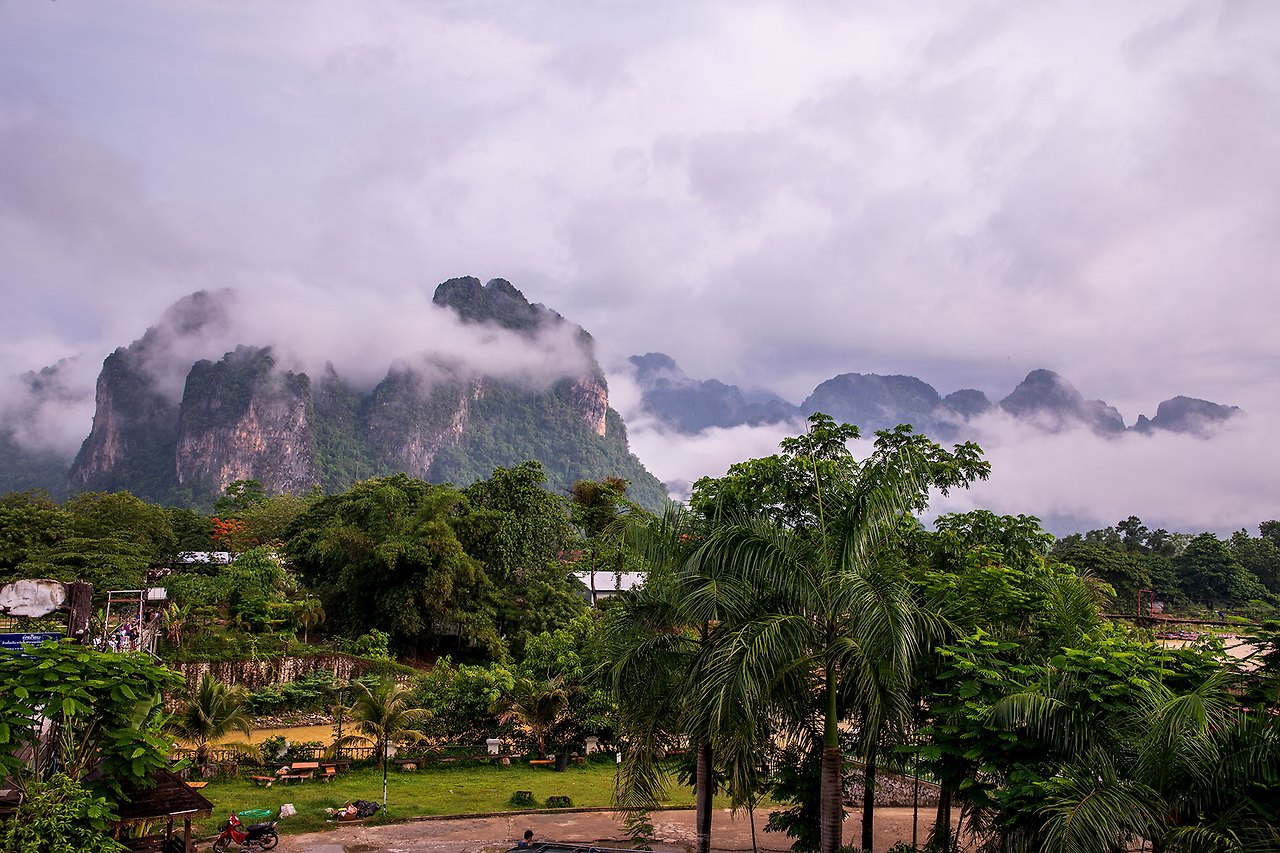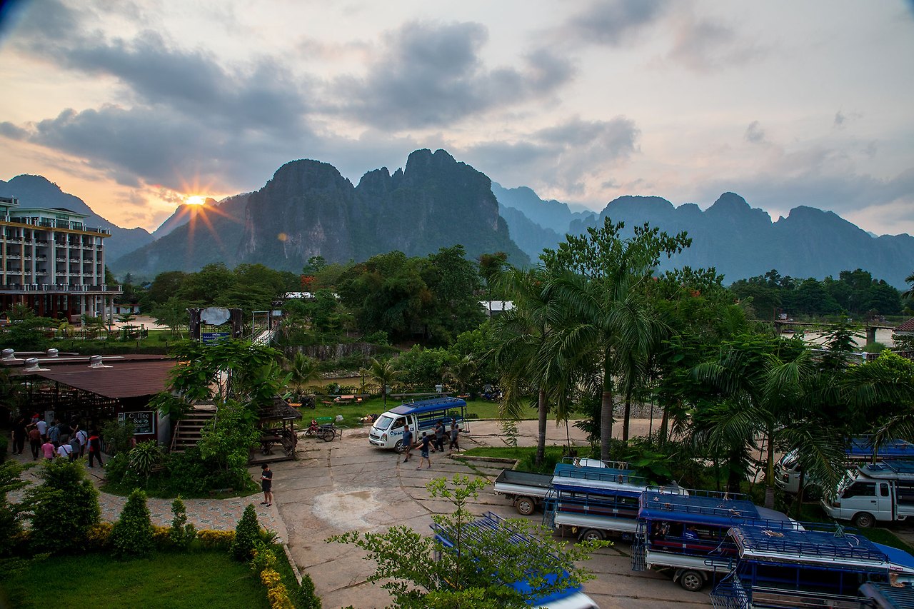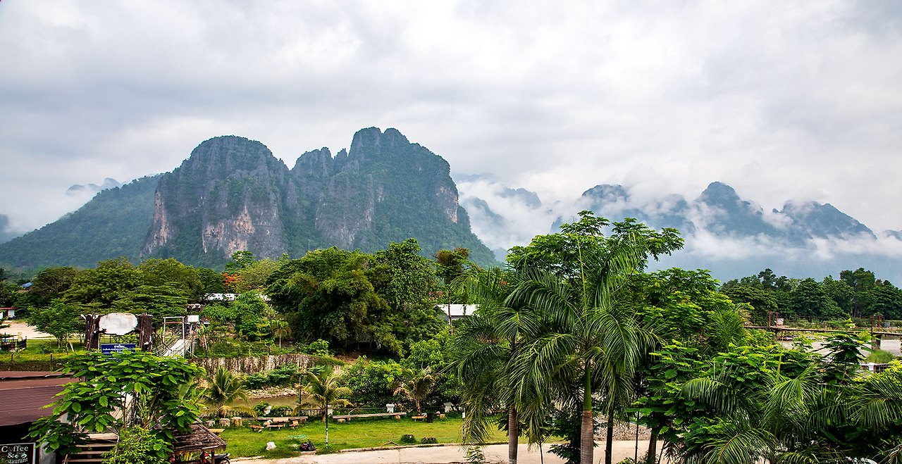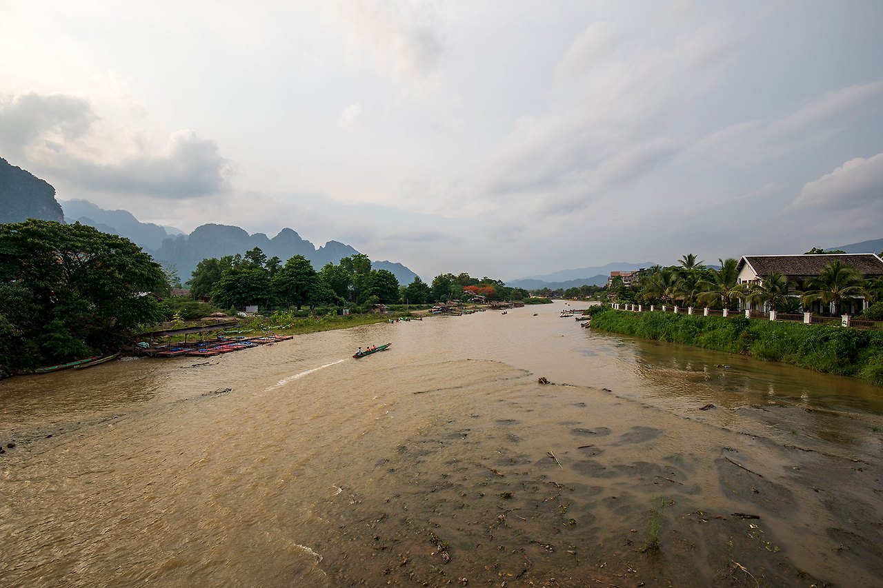 한눈에 방비엔 산들이 눈에 들어오며 흙탕물인 쏭강변에 위치하고 있다.