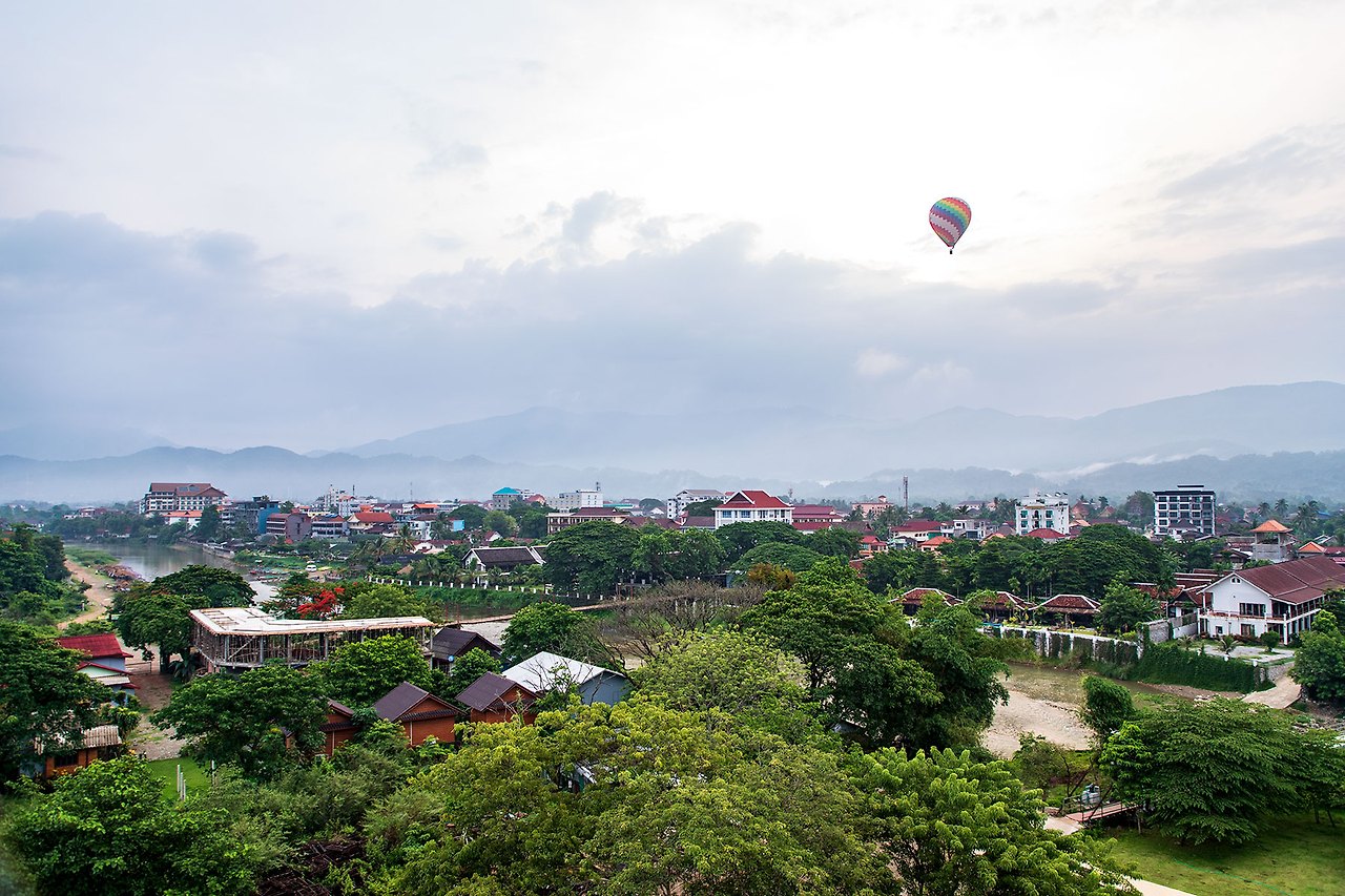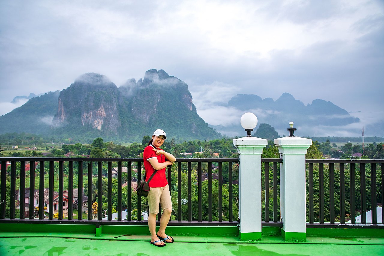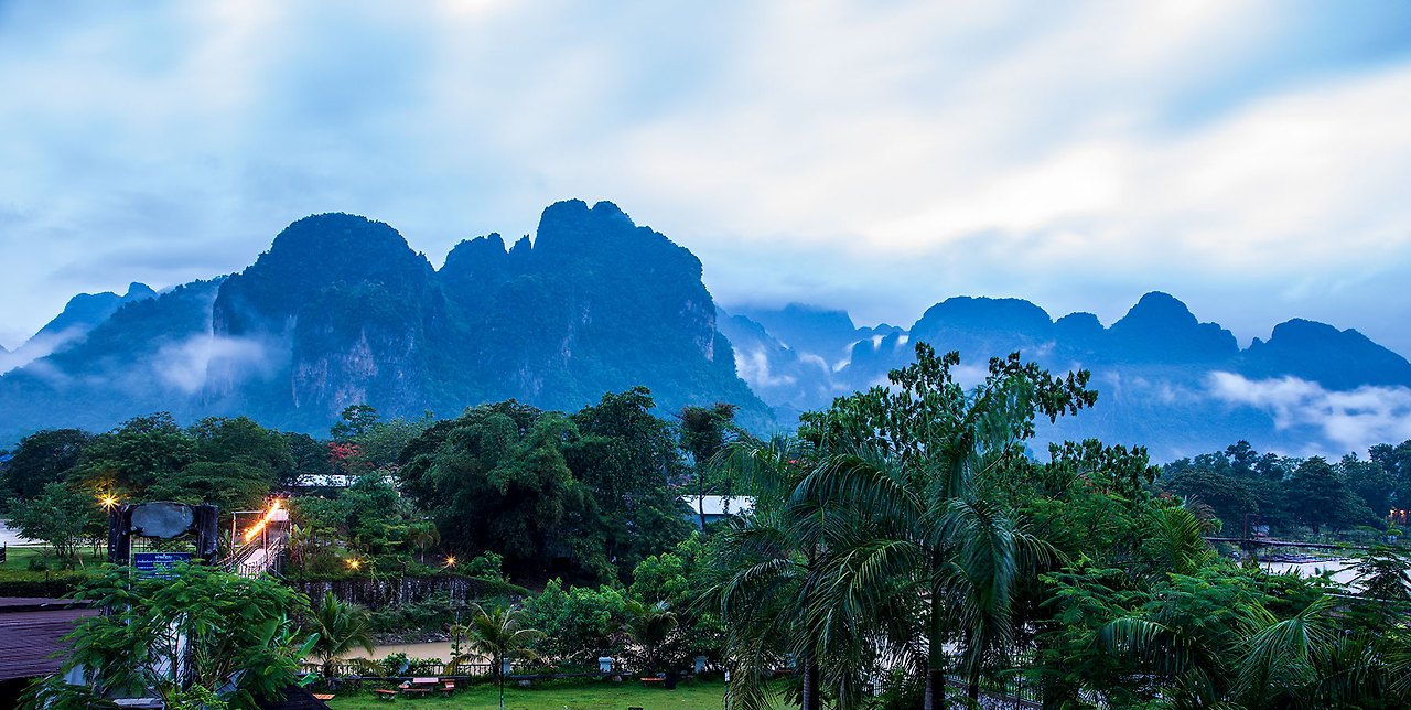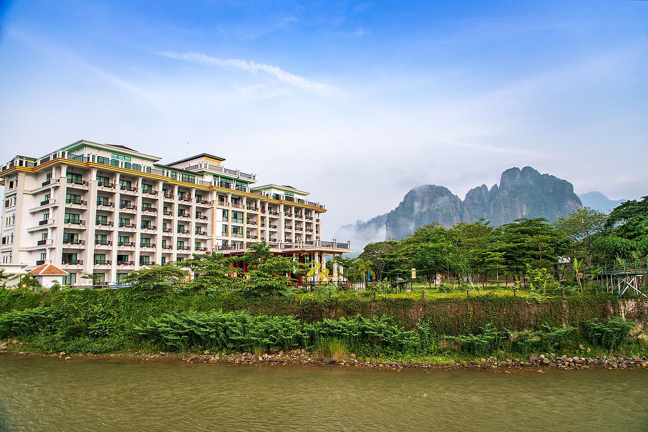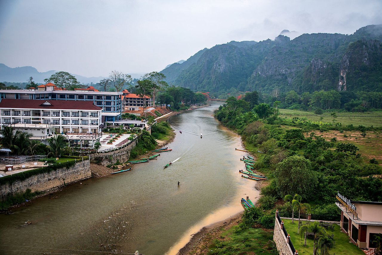 한눈에 방비엔 산들이 눈에 들어오며 흙탕물인 쏭강변에 위치하고 있다.