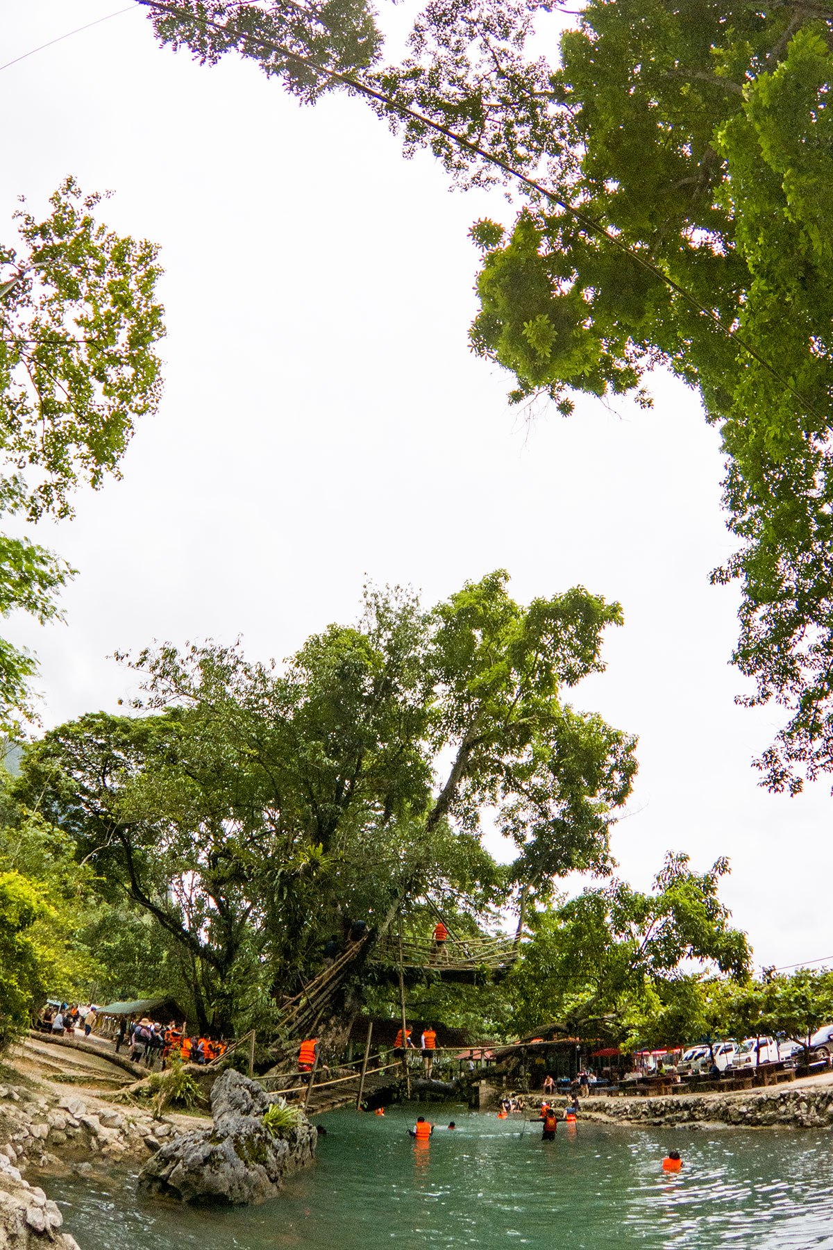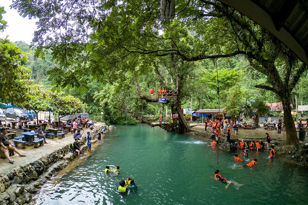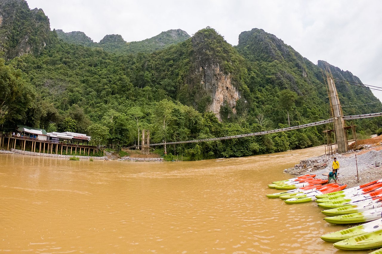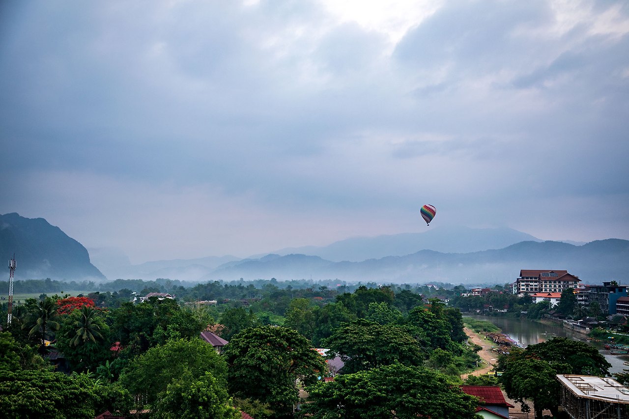 한눈에 방비엔 산들이 눈에 들어오며 흙탕물인 쏭강변에 위치하고 있다.
