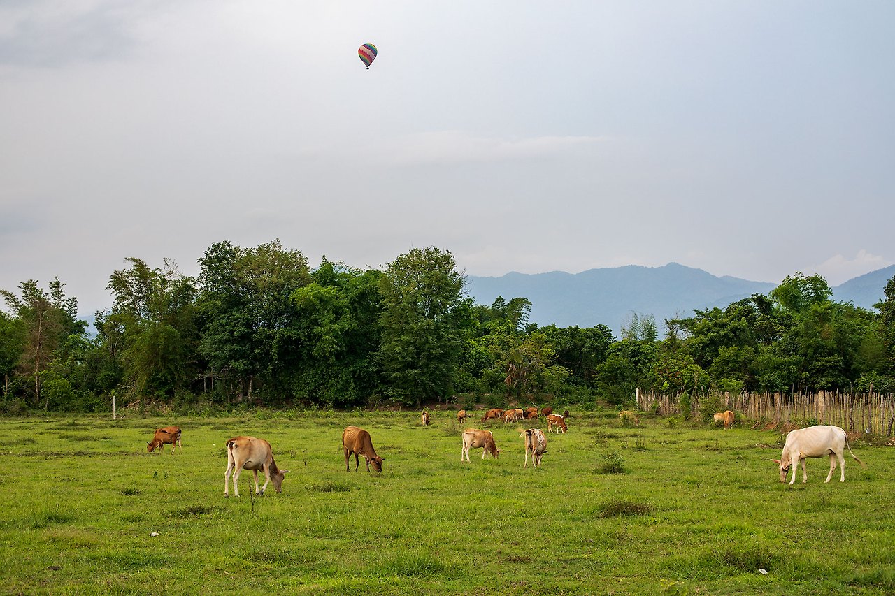 한가롭게 소들이 풀을 뜯고 있으며 그 뒤로는 기구를 띄워놓았다.