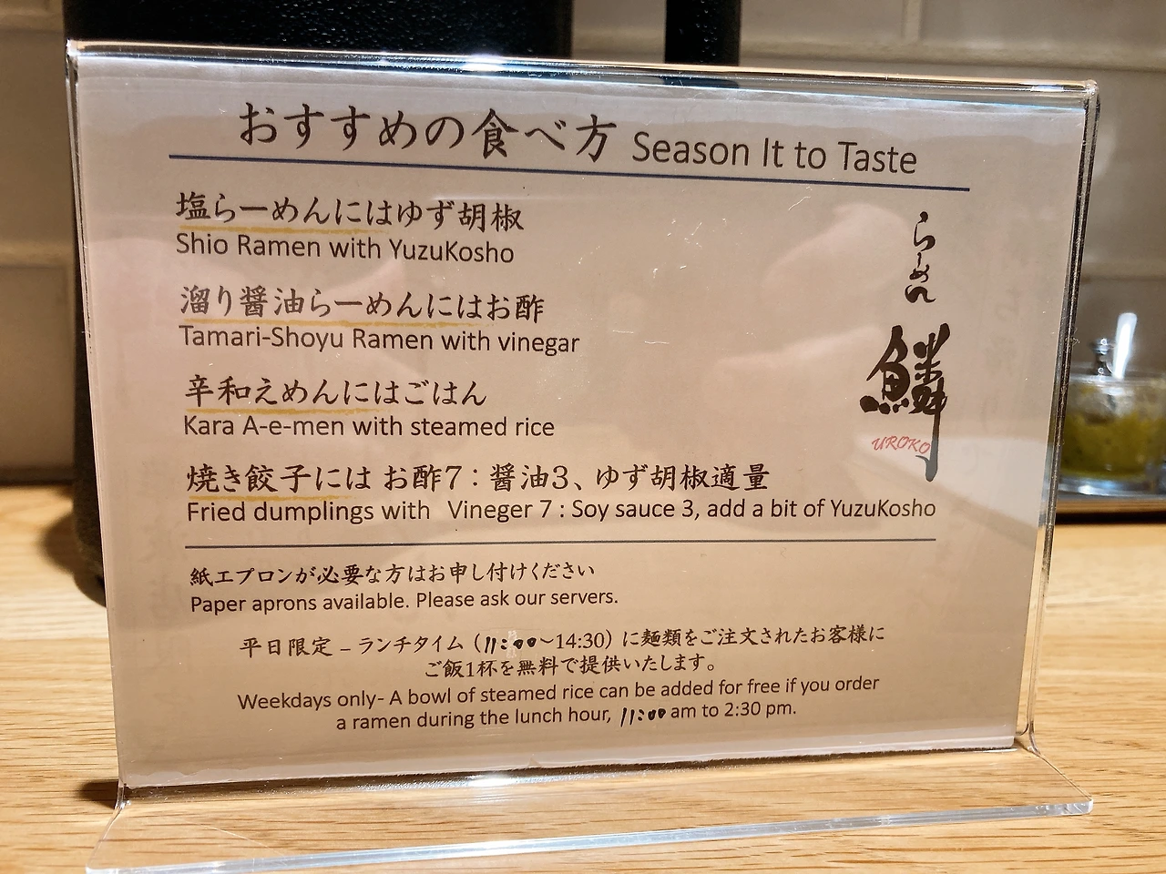 일본 라멘집을 보면 테이블 위에 육수를 설명하는 내용이 적혀있는 경우가 많은데 우로코의 라멘에 어울리는 조미료를 넣어 먹는 방법만 쓰여 있었다. 시오 라면에는 유즈코쇼를 넣어 먹으라고 하는데 유즈코쇼는 큐슈 지역에서 만들어 먹는 조미료인데 푸른 유자 껍질과 청 고추를 섞어 만든 맵고 산뜻한 맛의 조미료인데 육수가 해산물이라면 어울리지 않는 맛이다.