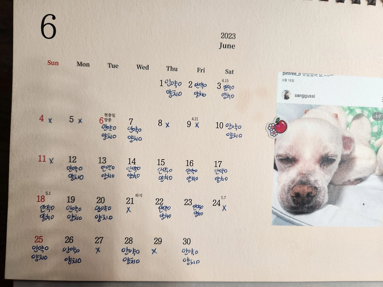 우리 집에는 반려견 상구의 달력이 있다. 5 년 전부터 상구의 1년 치 기록을 달력으로 만들고 있다. 매년 12월이면 온 가족이 일 년 동안 찍어 두었던 상구 사진을 놓고 편집을 하느라 바쁘다. 조금이라도 의미 있는 시간을 남기고자 하는 마음에 사진을 찍었던 날 무슨 일이 있었는가에 집중을 한다. 물을 싫어해서 수영을 안 하려고 버둥거리던 여름날도 기억하게 되고, 상구가 으르렁대며 쫓아가던 오리 떼가 돌연 푸드덕 날아오르자 기겁을 하고 놀라던 상구의 모습도 떠 올라서 이야기 꽃을 피우게 된다.