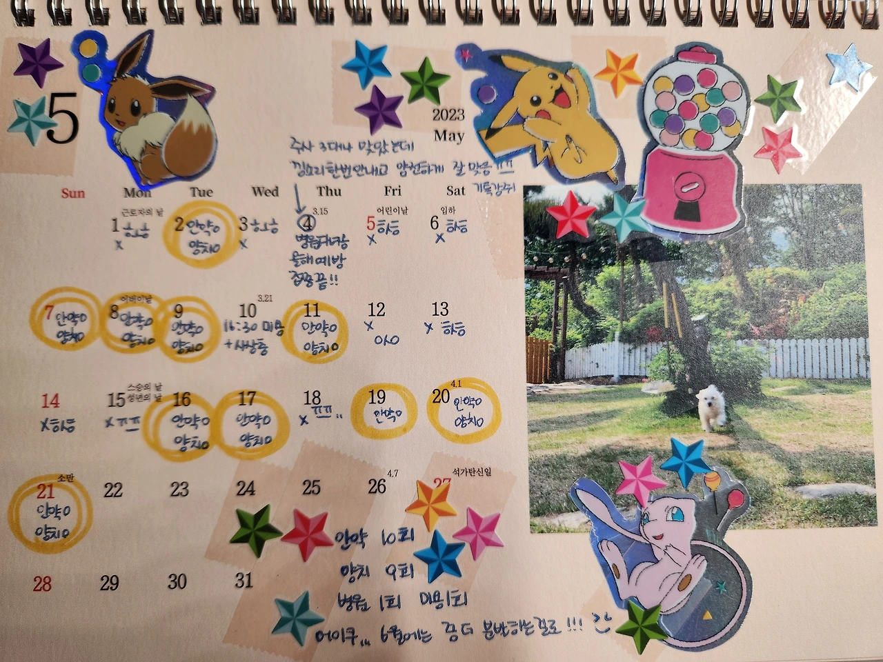 동물병원 의사 선생님은 상구가 이제 노인이 되었다고 한다. 작년부터는 관절 치료약과 안약을 처방받았다. 간식도 치아에 좋은 것으로만 골라서 먹이고 매일 양치도 시키라고 권고받았다. 상구는 심하게 뛰는 것도 줄여야 한다고 해서 한 시간씩 하던 산책 시간도 이십 분으로 줄였다. 딸들은 매일매일 이것저것 상구의 건강을 위해 달력에 표시를 하면서 챙기고 있다.