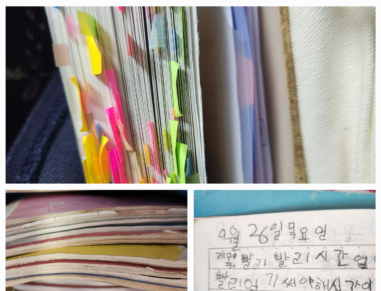 막내의 공부하던 책들. 21년 전 일기장나는 60이 다 된 지금도 일기를 쓰거나 메모를 한다. 하루라도 기록이 없으면 불안하다. 아이들에게도 그렇게 재밌는 습관처럼 일기를 쓰게 하고 싶었는데 교육 방법이 틀렸나 보다. 학교 다닐 때 일기를 혼날까 봐 썼다고 하니 벌써 재미없는 일이라는 생각을 하게 해 버린 것 같다.