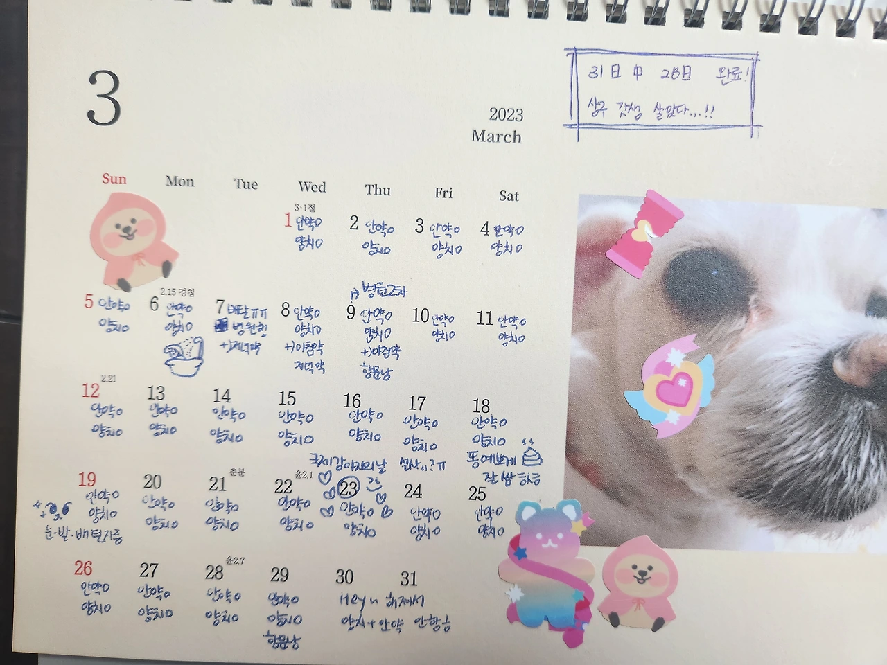 상구 달력에는 약에 관한 기록이 있고 병원 기록이 있습니다. 관리 덕분인지 그동안 상구는 자신이 강아지 인지 말인지 구분을 못할 정도로 뛰고 놀았습니다.