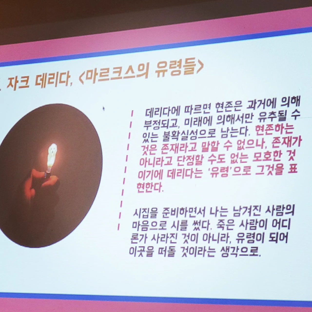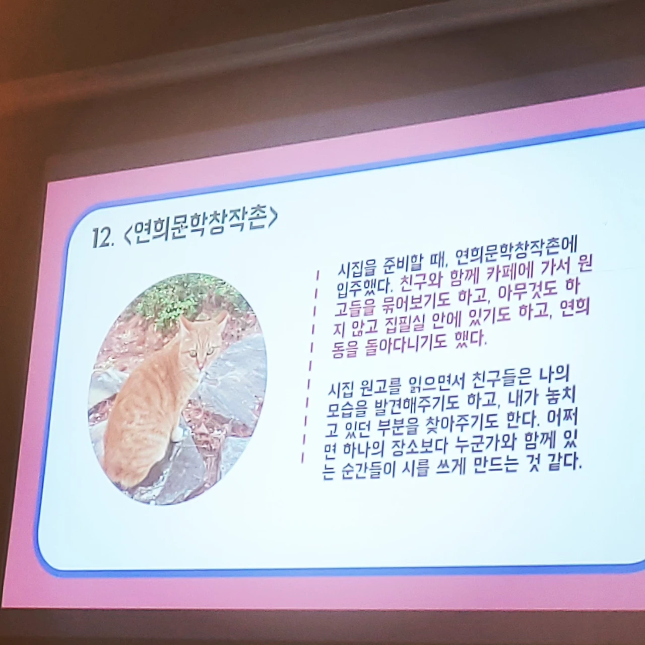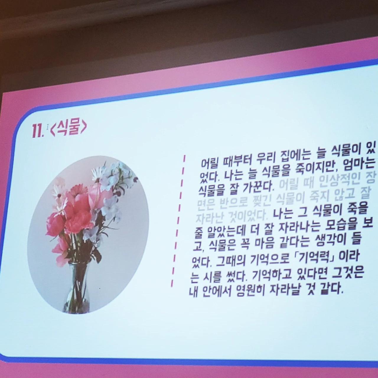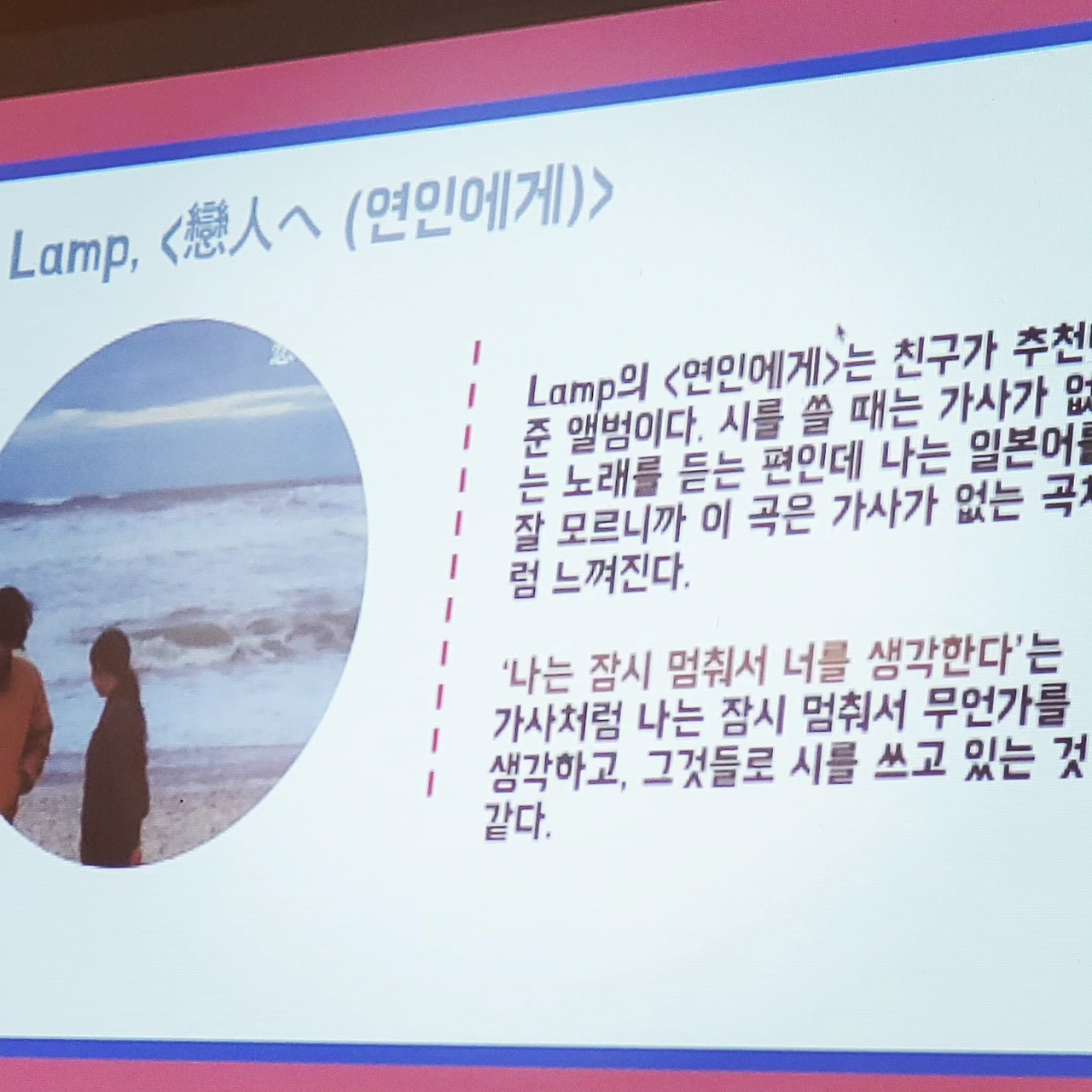자신이 준비해 온 ppt를 보여준다. 12개의 시를 쓰게 한 소스리스트를 이야기한다.