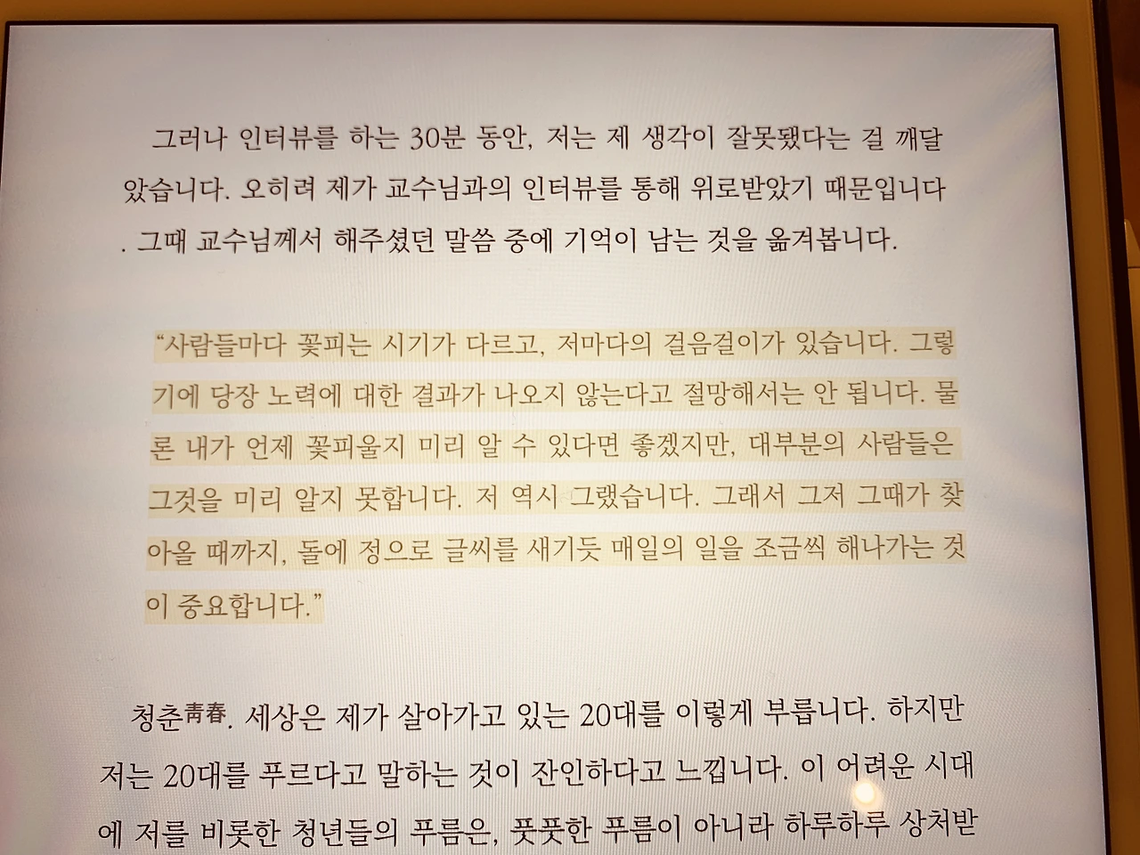 한동안 그렇게 자책을 하다, 얼마 전 읽은 [라틴어 수업] 책이 떠올랐다. 꽃피지 못한 청춘들에게, 그 시절은 근본을 만드는 뿌리를 내리게 하는 시기임을 가르쳐 준 명강의를 모아둔 책인 [라틴어 수업]은, 삶의 회의감에 빠져 있던 나에게 먹먹하지만 깊은 위로를 줬다. 특히, “아직 인생의 끝에 간 것이 아니기에, 우리가 지금 느리고 느리게 보여도 언젠가는 꽃을 피운다”는 메시지가 너무 좋았다.