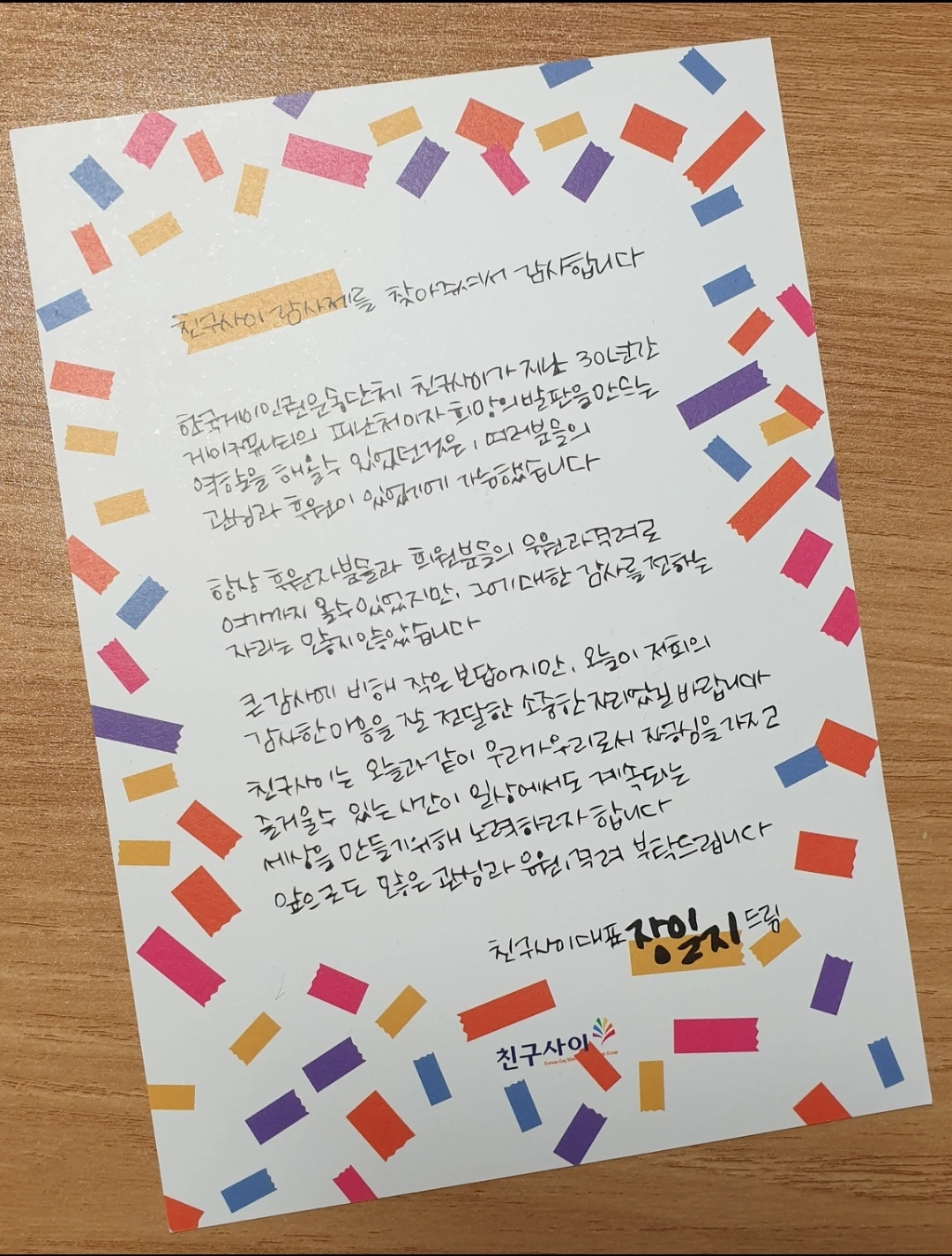 친구사이는 1994년에 결성된 성소수자 인권 운동 단체이다. 지난 9월 23일에 친구사이 감사제 행사가 있었다. 친구사이 30년을 기념하며 후원자들에게 감사를 표하는 자리였다. 나는 친구사이 회원은 아니지만 간접적으로 친구사이 활동을 하고 있어서, 지인과 함께 감사제에 참석하였다.