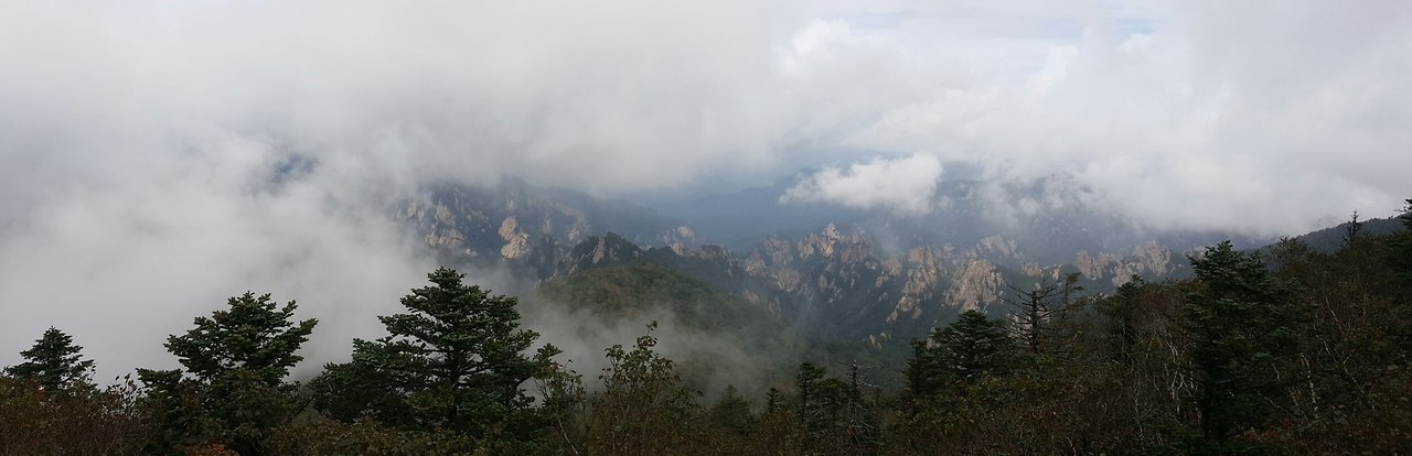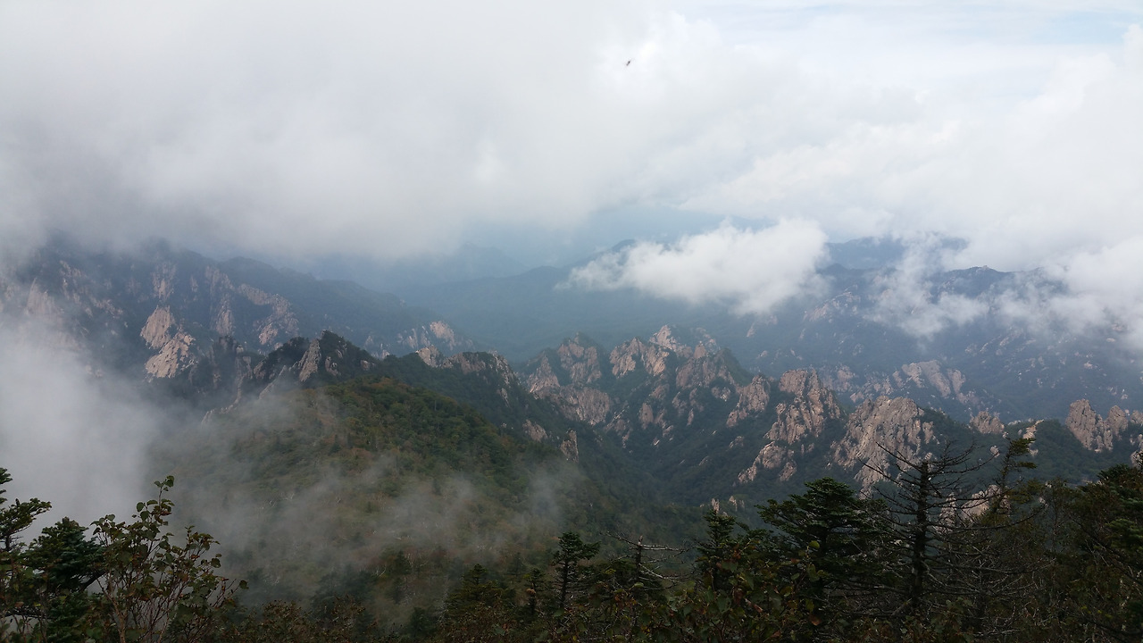 서북능선을 이제 시작한다. 서북능선을 걸으면서 왼쪽을 보면 용아장성과 공룡능선이 보인다. 구름이 걷히지 않아 못 보고 있었으나 끝청 주변에서 이를 볼 수 있었다. 구름과 암릉이 어울린다. 그 모습이 환상적이라 또 담아 본다. 저 능선을 사람이 근접하기 힘들쓸 밖에 없을 것 같다. 저러한 모습을 그림으로 사진으로 볼 수밖에 없는 사람들이 있어 이들을 위하여 케이블카를 설치하자고 양양군과 강원도에서 이야기를 한다. 하지만, 이곳에는 산양이 산다고 한다. 이들을 보호해야 한다고 이야기한다. 어느 것이 우선인지 모르겠다.