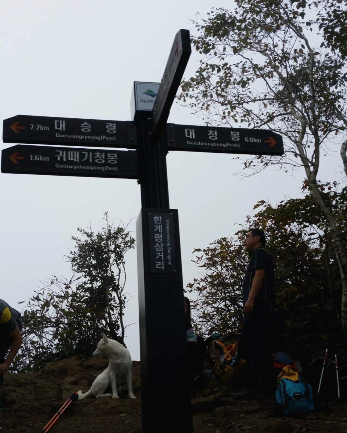 한계령 삼거리까지 가파르게 오른다. 멀리 귀때기청봉이 보이는 시점이 되어야 좀 한 숨을 쉴 수 있다고 보아야 할 것이다. 한계령 삼거리에서 귀때기청봉이 아닌 대청봉으로 방향을 잡고 간다. 누가 버리고 간 개인지 모르지만 이곳에 개 한 마리가 지키고 있다. 한계령 삼거리를 올라오는 사람들을 반긴다. 저 개는 1년 후에 저곳에 다시 갔는데 그곳에 또 있었다. 결론적으로 주인을 기다리는 개일 것이라고 생각한다. 주인이 개를 두고 갔는데 개는 그 주인을 기다린다고 보아야 할 것이다.