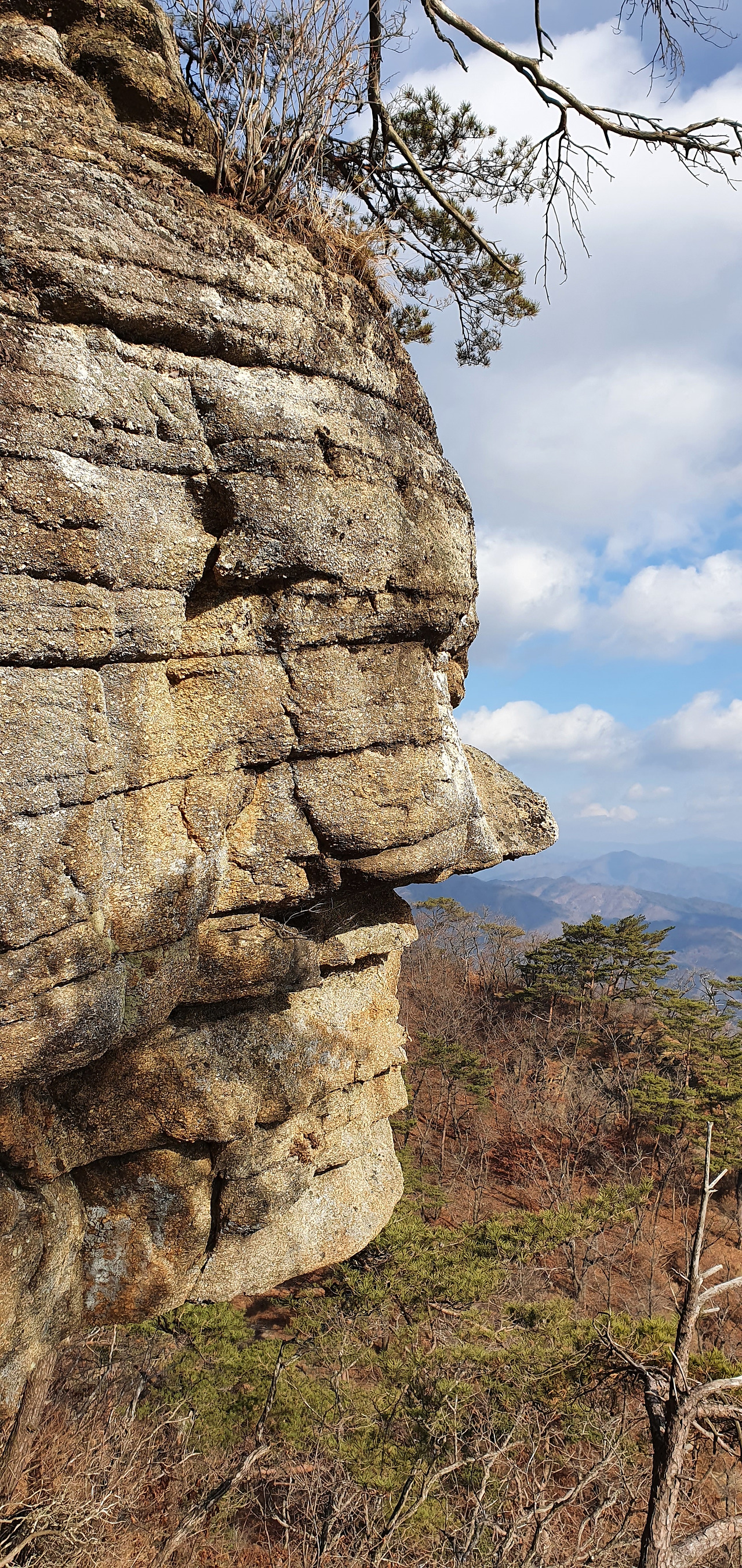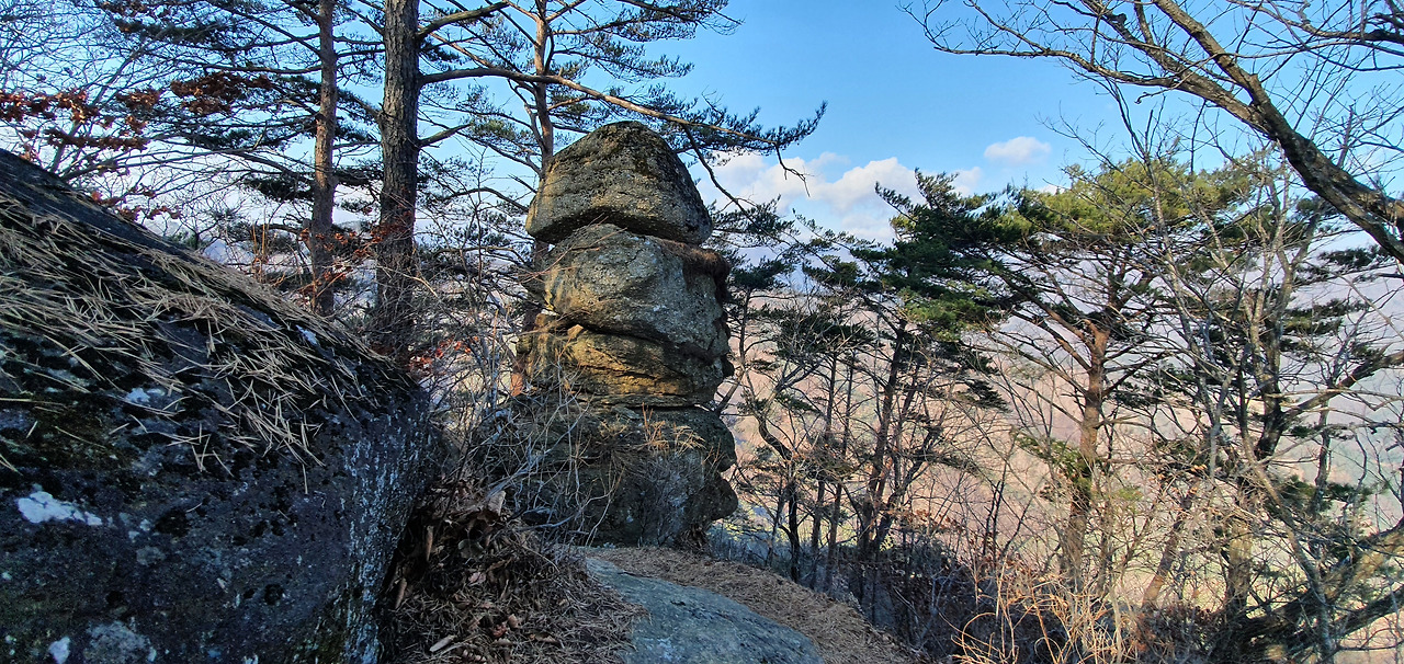 봉을 오르는 길에 밧줄을 잡고 오르는데 얼굴 바위가 있어서 멈추고 담아본다. 탑바위에 올라서 내려오면서 보니 바위가 장승 형태를 띠고 있어서 이것도 담았다.