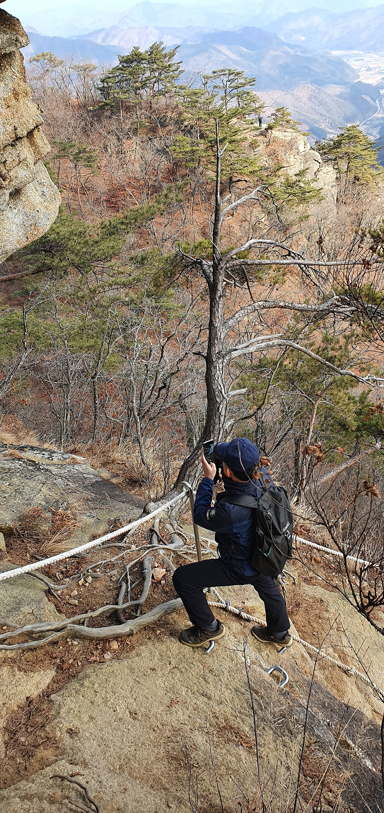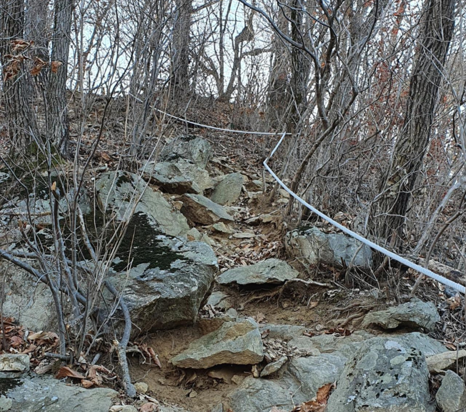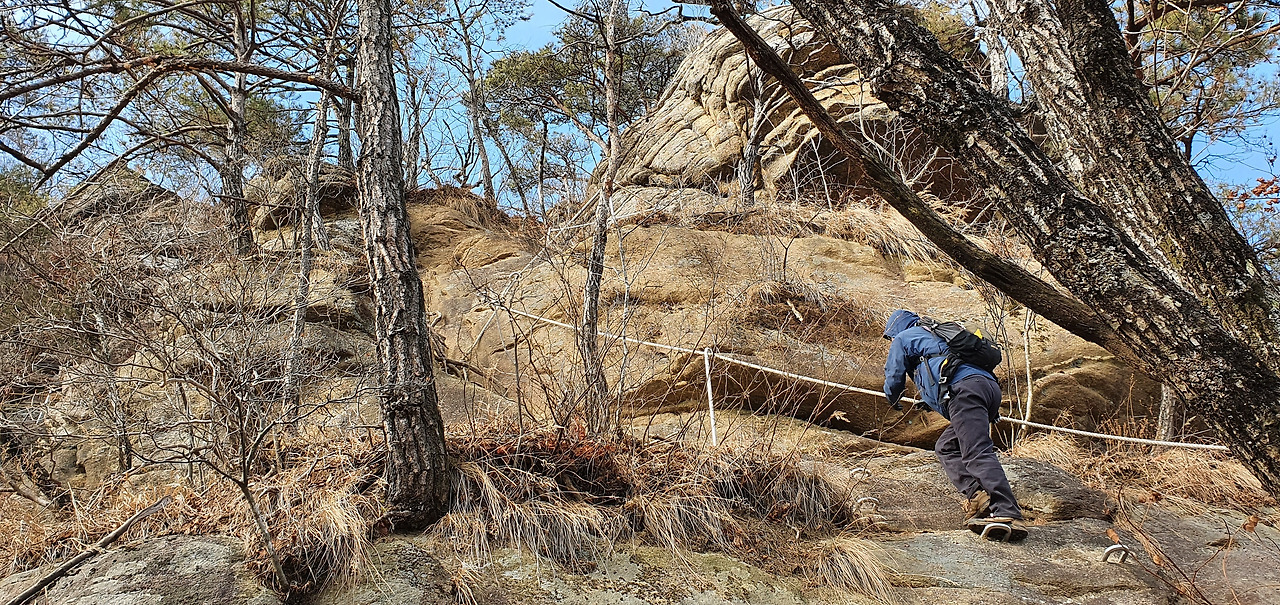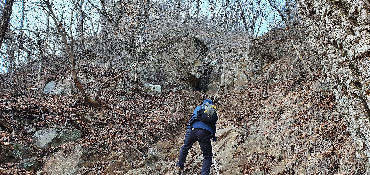 등산로 입구부터 가파르다. 밧줄이 우리를 기다린다. 영하 7도라는 예보가 있어서 두꺼운 옷을 입었고 장갑도 끼었으며 머리에 방한모도 썼다. 그래도 춥다고 느낀다. 겨울 초입에 제일 춥다. 몸은 적응이 되지 않았는데 겨울은 성큼 다가왔다. 그리고 원주, 제천이 오늘 제일 춥다고 하는 일기 예보도 있었다. 아직 눈이 없었기에 오르는데 무리는 없지만 오르막이 가파르다.