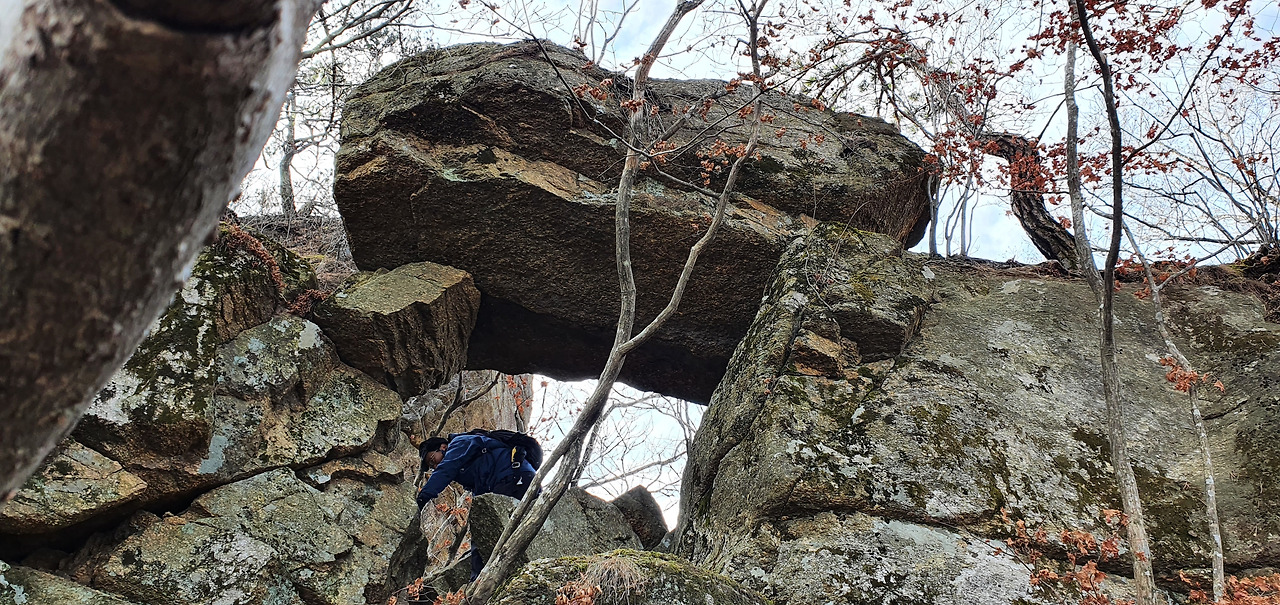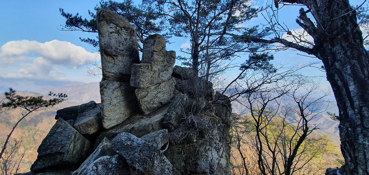 1봉(탑바위봉)을 올라서 멀리 조망을 하면서 낭떠러지를 보고 저능선을 보려고 왔는가 하는 쾌감을 가진다. 정상을 오르는 것이 중요한 것이 아니라 반대편을 보는 것이 더 상쾌한 기분이라고 할 수 있다. 전자지도를 보면서 이봉이 1봉인 탑바위 봉이라는 사실을 알았다. 현 위치를 확인하고 탑바위를 찾는다. 자연석이 탑을 이루고 있다.