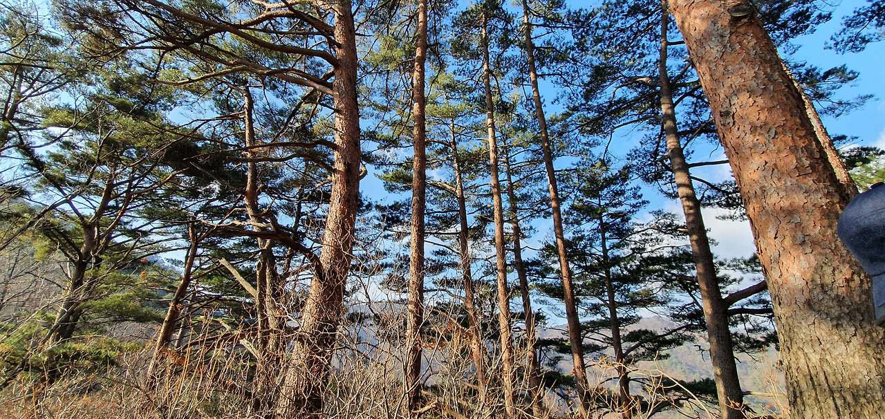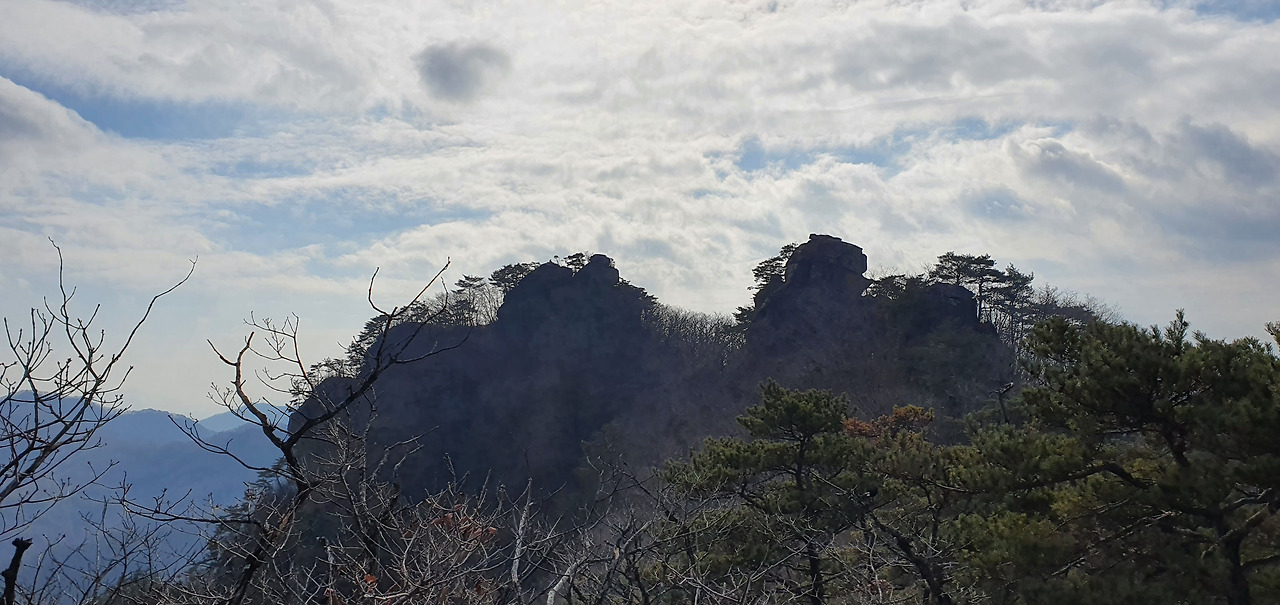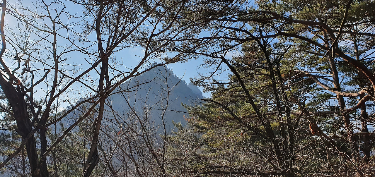 한 번, 두 번 밧줄을 의지하면서 가파르게 오르면서 이제 1봉(탑바위 봉)이 보인다. 멀리서 보니 뾰족하다. 소나무 숲이 멋있다.