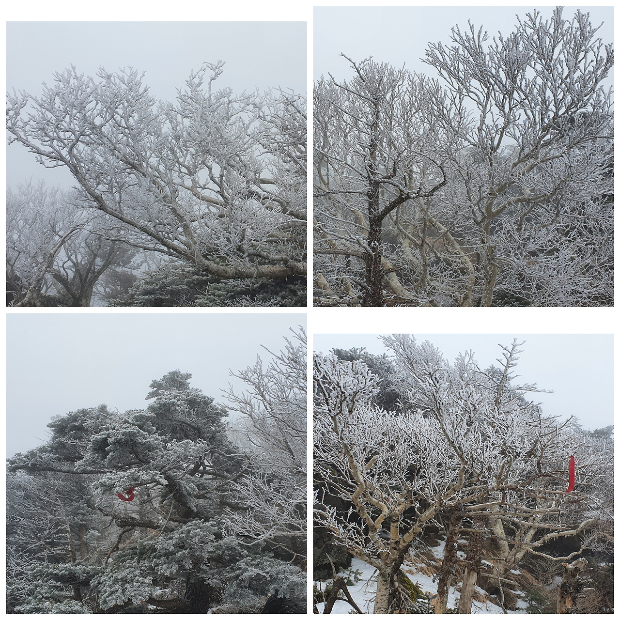 능선을 넘는 바람이 약하기 날리는 눈발을 나뭇가지와 구상나무 잎에 쌍이면서 이제는 눈꽃을 만들고 있다. 잡목에 눈이 얼면서 하얀 산호초를 산 위에 형성하고 있다.
