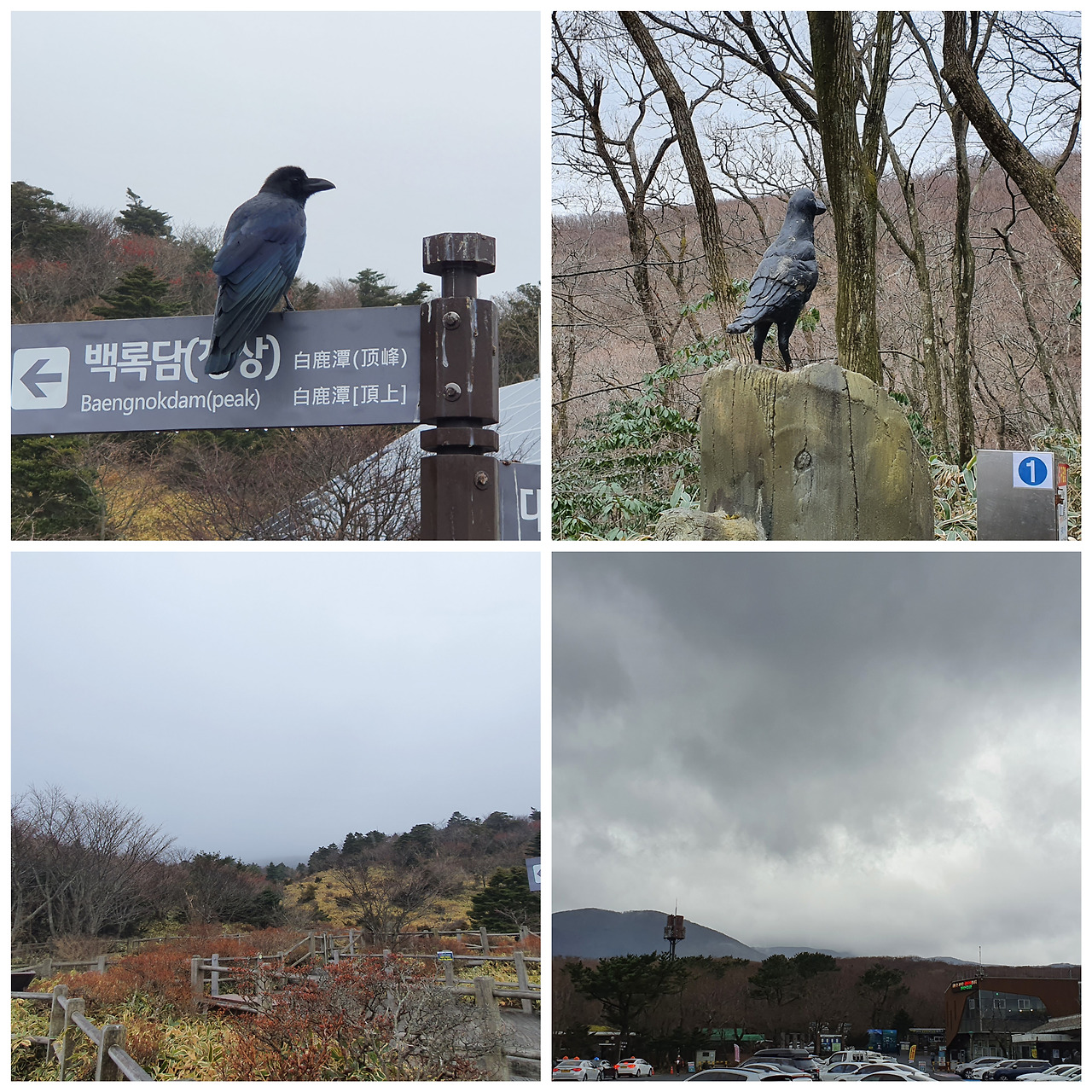 눈이 왔을 때는 산객들이 눈을 구경하고 있지만, 비가 오면 사람들은 서두른다. 눈은 구경을 하지만, 비는 피한다. 진달래 대피소를 지날 때 정상을 바라보지만 구름에 샇여 있을 뿐이다. 한라산은 유난히 까마귀가 많은 것 같다. 탐라계곡의 목교를 지나 가파른 계단을 오르자마자 까마귀로 만든 조각이 있는데 실물과 유사하다. 진달래 대피소에서 이정표에 앉아 있는 까마귀나 조각의 까마귀나 어느 것이 실물인지 모를 정도로 잘 만들었다.