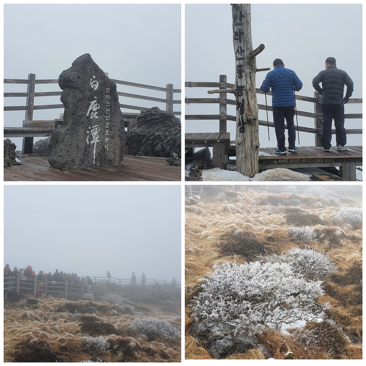 백록담은 보이지 않는다. 구름은 백록담 주변을 감싸 10m 정도의 아래도 보이지 않는다. 사람들은 백록담을 보지 못하는 아쉬움을 백록담 정상석의 인증샷을 남기기 위하여 기다린다. 길게 늘어선 줄은 줄어들 줄 모르고 눈발이 날릴 뿐이다. 풀밭에 있는 나무에도 눈이 내려서 풀은 눈을 녹이고 나무만 눈을 머금고 있다. 40분을 기다려 인증샷을 남기고 이제 성판악 쪽으로 하산을 한다.