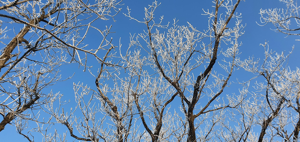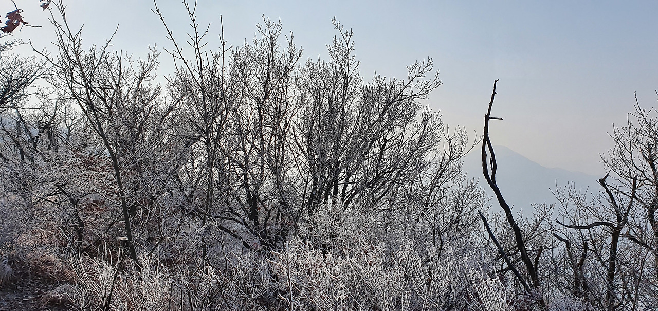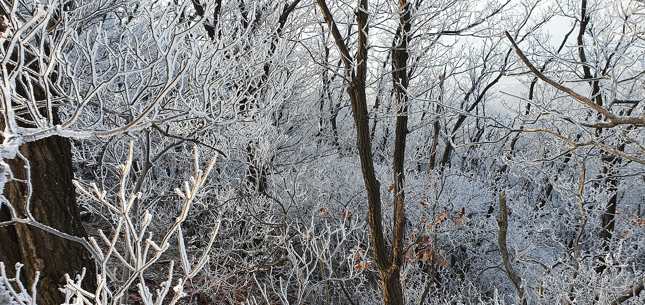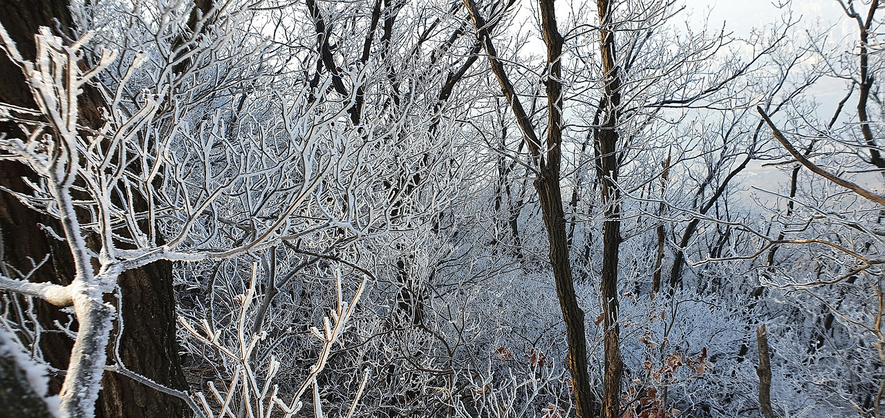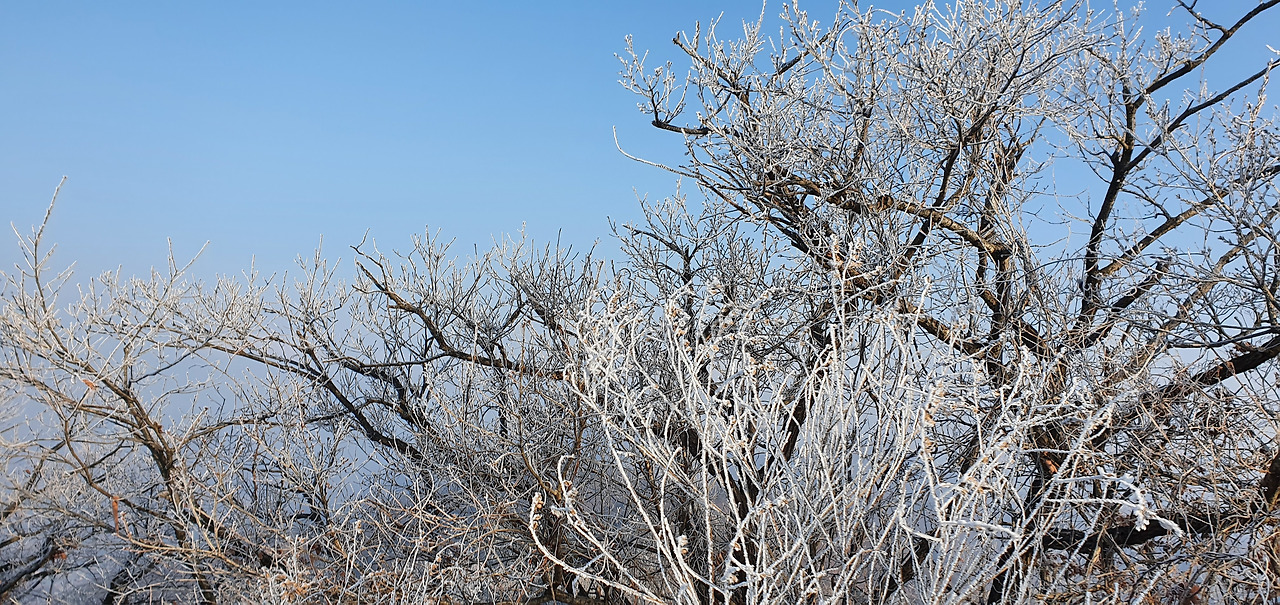 예봉산을 오르는 길은 얼어 있어서 조심스럽게 오른다. 겨울산은 조심이 가장 중요하다고 할 수 있다. 그냥 가다가 다치면 본인만 손해다. 장비가 필요한 것은 준비를 해야 한다. 오르자마자 상고대와 하늘을 동시에 담는다. 겨울산을 오를 때마다 상고대 사이에 비취는 하늘이 너무 멋있다.