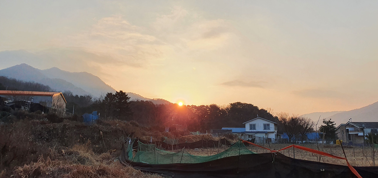 예봉산을 오를 때 평상시 가보지 않은 길을 가보기로 하고 팔당역에서 팔당대교 방향으로 산행 입구를 찾기 위하여 기웃거리면서 걷는다. 첫 골목에 들어가서 등산로 입구인가 하여 언덕을 오르니 우리가 갈 방향은 아니고 떠오르는 태양이 우리를 반긴다.