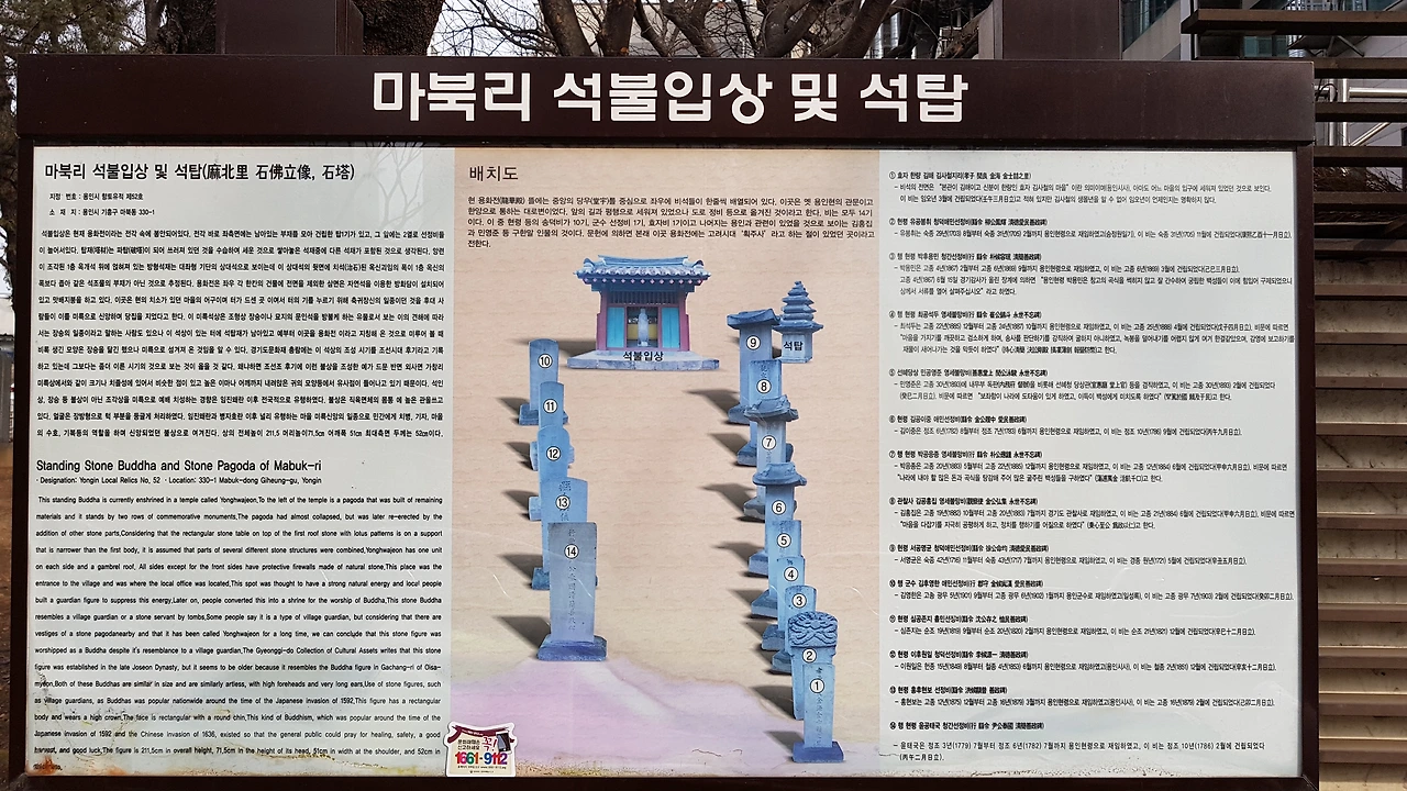 마북동은 이제 도시화가 되어 있고 주변의 아파트촌이 즐비하다. 석불입상과 석탑이 자리를 지키고 있을 뿐이다. 누군가가 저것이 무엇인지 알고 싶을 경우 동네 주민들이 이곳이 무엇인가 알고 싶을 경우를 대비하여 안내간판을 잘 구비하여 놓았다고 볼 수 있다. 사찰도 없고 하니 이제는 지방자치단체가 이를 관리할 뿐이라고 할 수 있다.