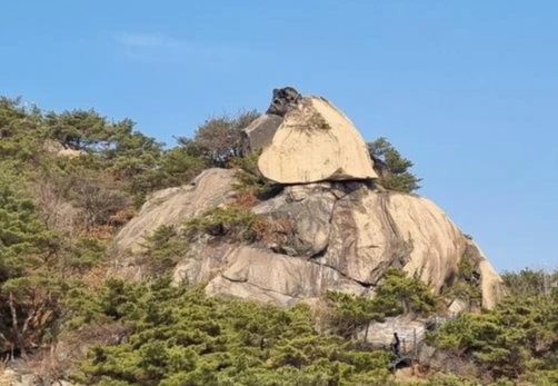 이 길이 이렇게 힘들다면 안산에서 서대문 독립공원을 거치지 않고 인왕산을 갈 것인데 휴회를 한다. 선바위에서 올라오는 길과 안산에서 올라오는 길에서 그냥 내려다보면서 후회를 할 뿐이다. 멀리 안산이 보이고 이웃한 바위가 화강암 지대에 현무암이 있다. 돌출변수는 항상 무엇인가 궁금증을 자아내고 사람들에게 흥미를 끈다. 현무암과 같은 바위에 하얀 글씨가 이채롭다. 현무암은 아니다. 멀리서 보면 모자바위다.