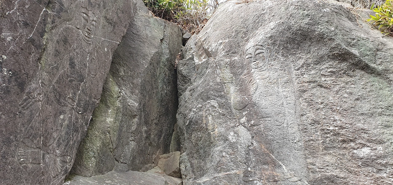 오늘도 57번 국도를 건너서 문수봉으로 올라간다. 문수봉을 내려오다 보면 마애보살상은 절터로 추정되는 곳에서 50m 떨어진 바위면에 조각한 높이 2.7m의 마애불이 있다. 바위를 잘 다듬어서 양쪽으로 대칭되게 선 두 보살상을 새겼는데, 돋을새김과 선으로 새기는 기법을 같이 사용했다고 한다. 좌우대칭으로 배열된 이 보살들은 같은 사람이 제작한 것으로 여겨진다고 설명되어 있다. 이 상들의 특징은 상체에 옷(법의, 法衣)이 표현되지 않은 반라상(半裸像)이라는 점인데 이러한 요소는 남쪽 지역의 불상에서 보이는 특징으로 경기지방에서는 그 예가 드문 형식으로 이 두 보살상은 신체에 비해 얼굴이 크고, 어깨를 움츠려 경직된 모습을 보이지만 대담하게 단순화시킨 모습과 얼굴, 손, 발 등의 세부 표현에서 고려 초기의 양식을 볼 수 있다고 영남길 안내서에 설명이 되어 있다.