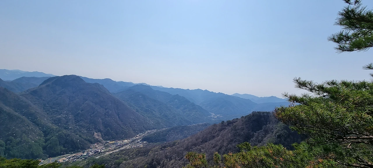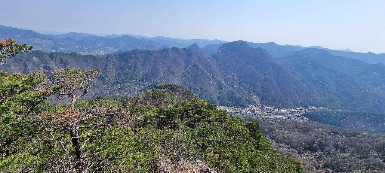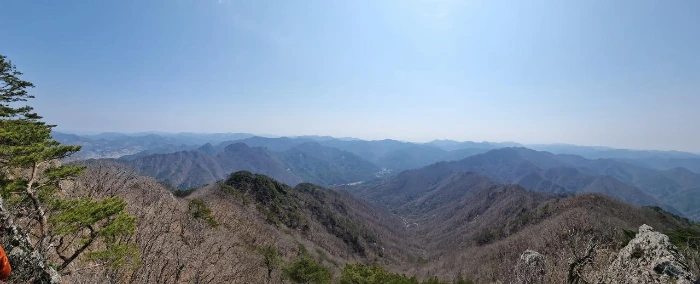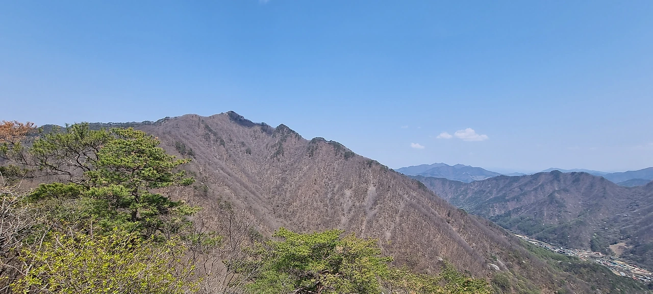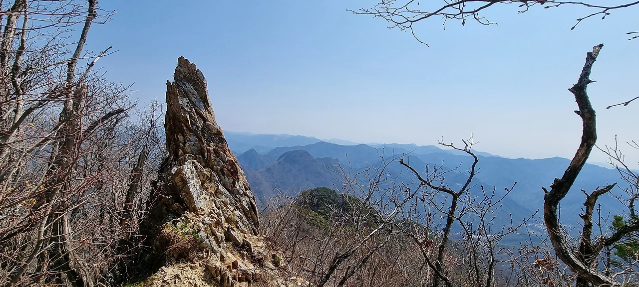한숨을 쉬고 나면 능선이다. 오른쪽은 절벽과 기암괴석이 있지만 조망은 있는데 사진으로 담기에 부족하다. 산이 울창해진 것은 좋은데 이제는 나무들이 앞을 가린다. 그래도 산이 울창한 것이 좋다. 아무리 조망이 좋아도 벌거숭이 산은 우리에게 피곤할 뿐이다. 그래도 조망할 수 있는 지점이 나타나 한번 담아보았다.