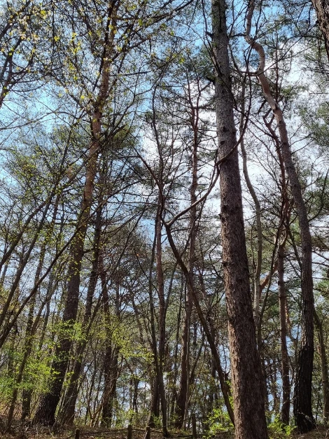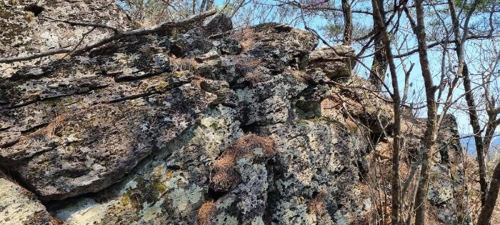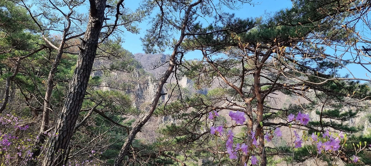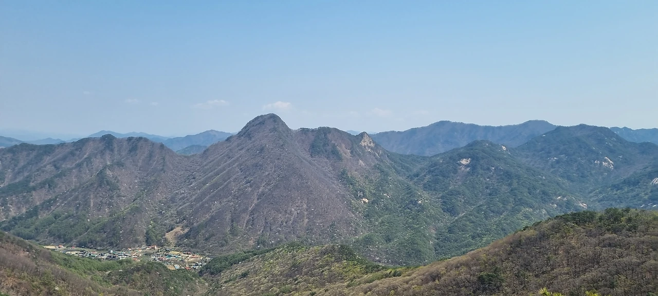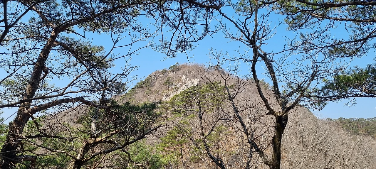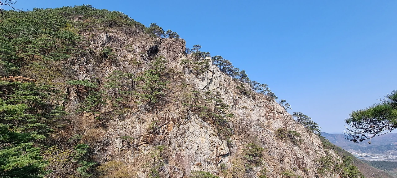 한숨을 쉬고 나면 능선이다. 오른쪽은 절벽과 기암괴석이 있지만 조망은 있는데 사진으로 담기에 부족하다. 산이 울창해진 것은 좋은데 이제는 나무들이 앞을 가린다. 그래도 산이 울창한 것이 좋다. 아무리 조망이 좋아도 벌거숭이 산은 우리에게 피곤할 뿐이다. 그래도 조망할 수 있는 지점이 나타나 한번 담아보았다.