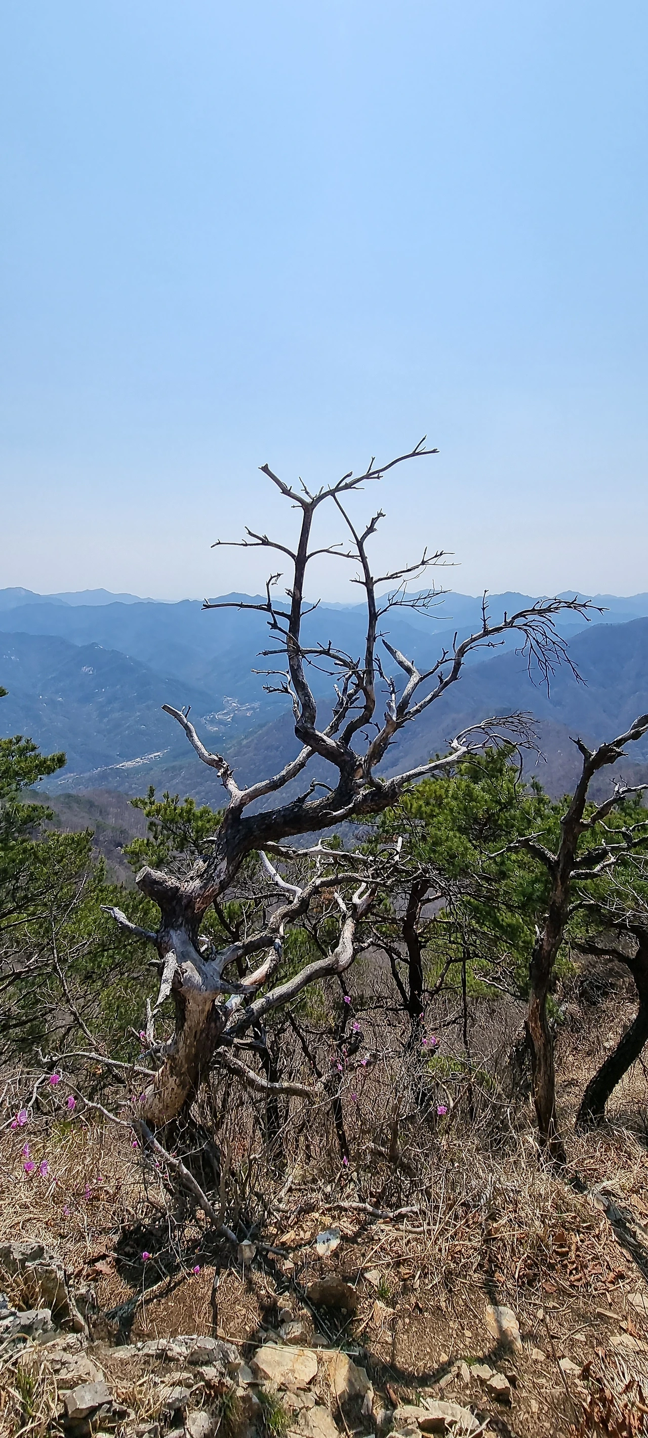 봄이지만 해발 800m 지점에 오니 이제 진달래가 피고 있다. 봄에 산을 오르다 보면 산 밑은 봄인데 산 위는 아직 겨울이다. 적도 가까이 있는 산도 고도가 높으면 설산이 되는데 이래서 있는 것 같다. 해발 100m를 올라가면 0.5℃~1.0℃ (평균 0.65℃)씩 내려간다고 학교 때 배운 기억이 있다.