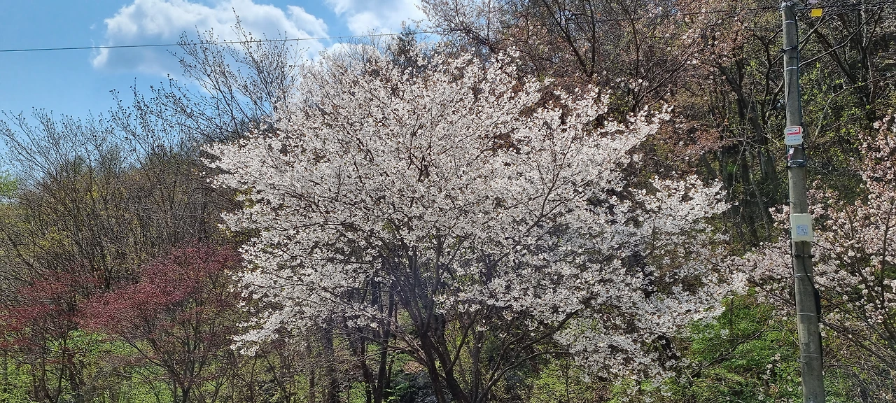 군자산을 갔다 와서 힘도 남고 시간도 남고 해서 칠보산을 오르는 이도 많다고 한다. 우리도 그 편에 속했다. 멀리서 왔고 시간을 최대한 이용하여야 하기 때문이다. 산행을 안내하는 버스에서 가능하다고 하였고 버스를 소금강 휴게소에서 내려 준 후 쌍곡휴게소에서 우리를 다시 탑승시킬 것이다. 군자산 도마골로 내려온 후 칠보산 산행을 위하여 걷는다. 다른 곳은 벚꽃이 다 졌는데 이곳은 아직 벚꽃이 만개하고 있다.