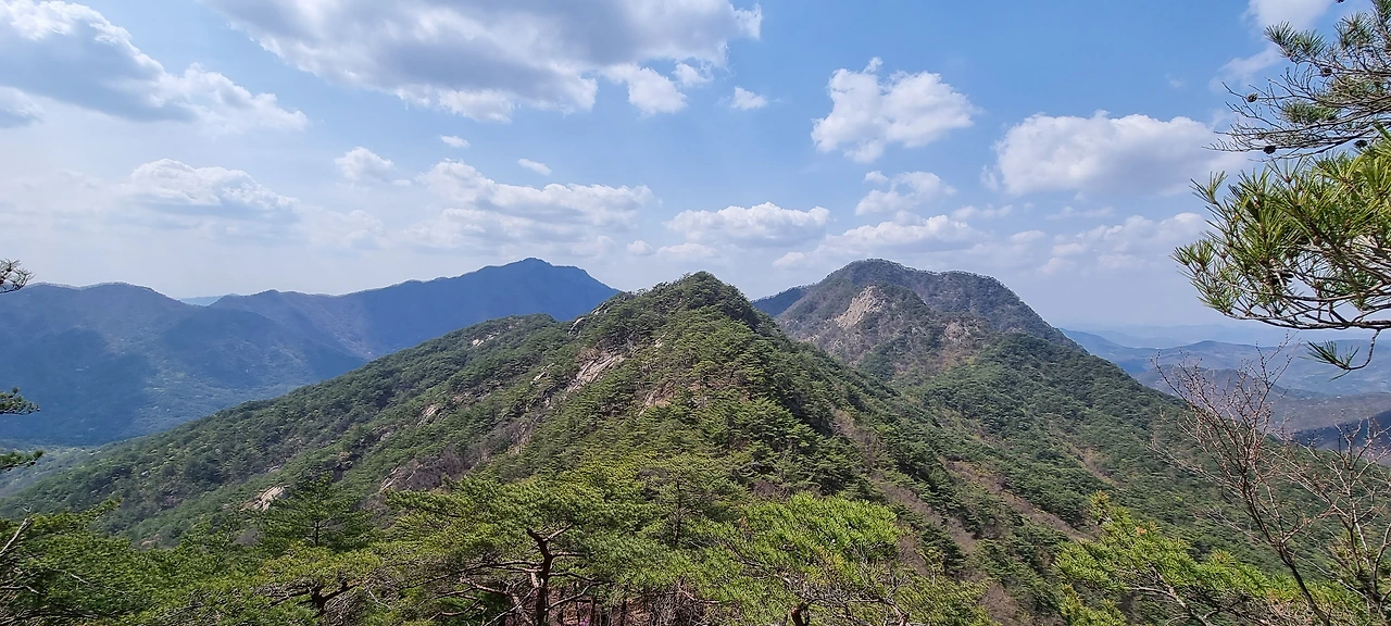 능선을 오르다가 전망대가 나타난다. 오르다가 전망대로 와야 한다. 바로 오르면 중절모 바위인데 참지 못하고 보배산과 멀리 군자산을 동시에 감상한다. 이렇게 조망되는 곳이 몇 되지 않는다. 함께 걷는 분이 힘들어하여 나 혼자 전망대를 간다. 힘들 때 잘 쉬어야 한다. 쉴 때는 쉬어야 한다. 그렇지 않을 경우 문제가 발생한다. 그리고 잘 쉬어야 한다. 자세도 바르게 하여야 한다.