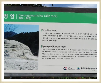 건너편 산의 암석이 떡바위는 아닌데, 모르겠다. 저 바위는 무엇일까 하고 사진을 담아본다. 인터넷에 찾아보니 병암과 떡바위는 쌍곡구곡에 명물로 알려진 바위이며 병암, 떡바위는 같은 말로 도로변에 자리 잡고 있고 주변에 카페나 식당, 펜션들이 있어 많은 관광객들이 잘 살펴보지 않는다고 한다.