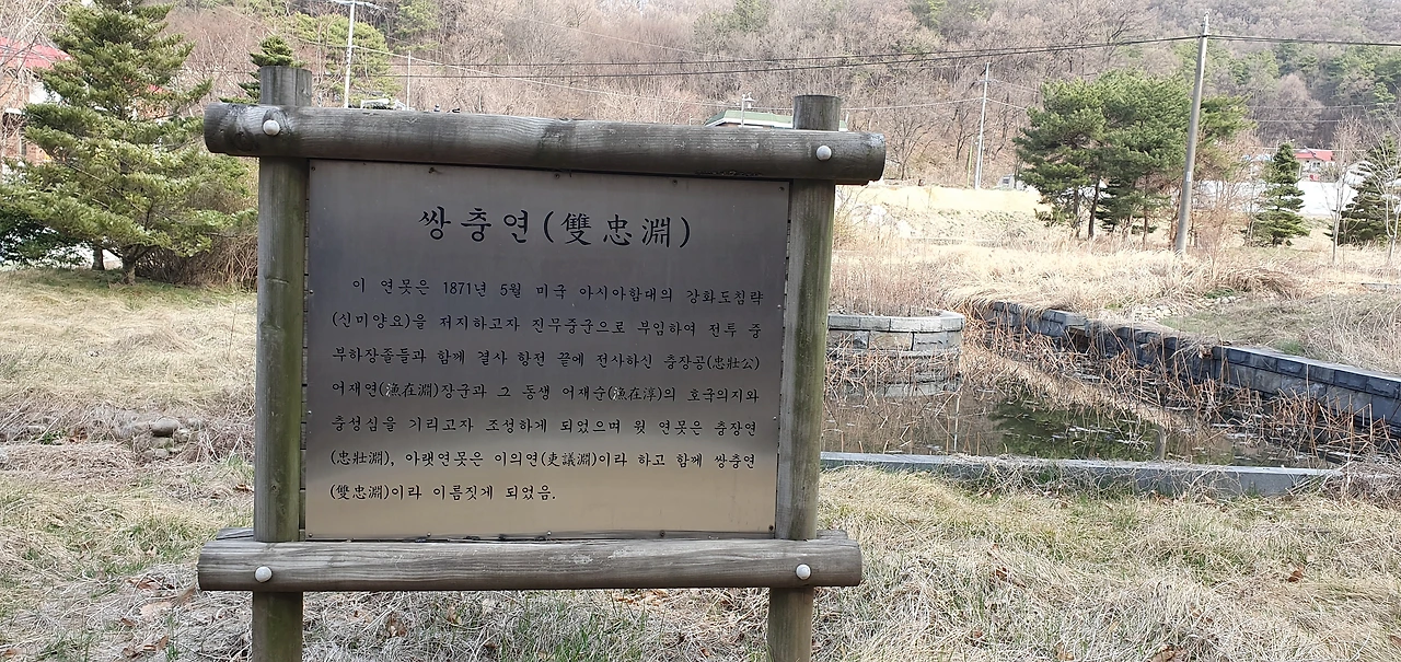 마을 입구에 있는 쌍충연이다. 어재연 장군과 동생인 어재순의 호국의지와 충성심을 기리고자 조성한 연못이라고 한다. 연못이 두 개이며 윗 연못은 충장연, 아래 연못은 이의연이라 하였다. 마을 주민들이 이들 형제를 기리기 위하여 이를 조성하였다고 한다.