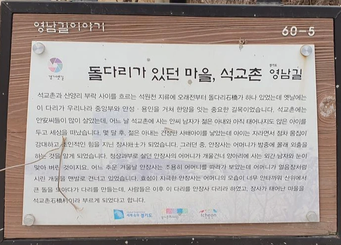 개울에 놓여 있는 다리를 건너는 데 스토리텔링이 있다. 돌다리가 있던 마을 , 석교촌 이야기이다.