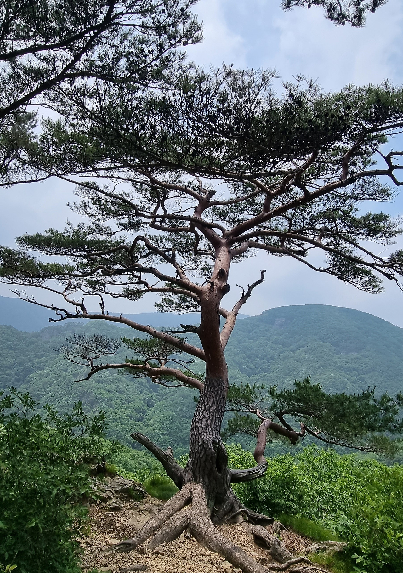 주변 사람들이 있다. 그래도 봉 정상을 바로 앞에 두고 1봉을 오르면서 힘들었던 다리와 폐에게 휴식을 잠시 준다. 근처에 있는 나무가 의자 모양을 하고 있다. 바람 등에 의하여 나무가 충격을 받아 굽었으니 다시 하늘을 향해 머리를 세우고 사람들에게 위안거리를 주고 있다.