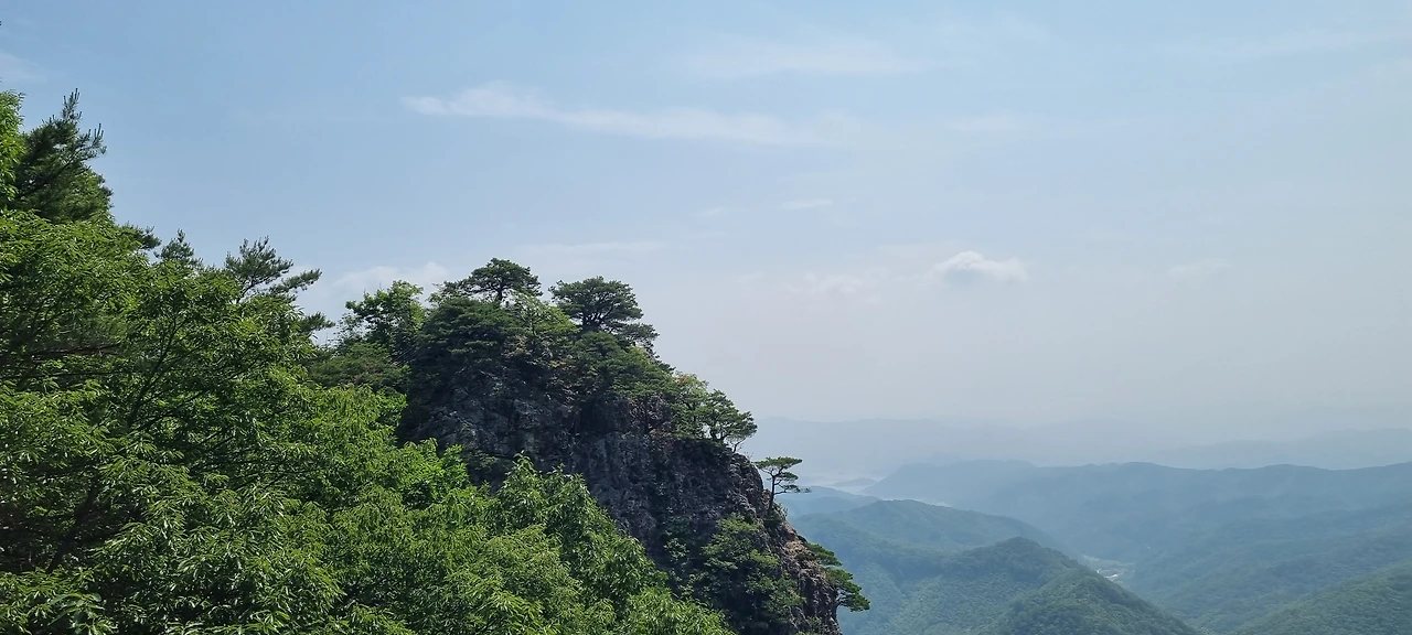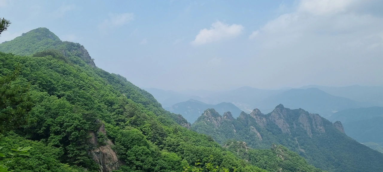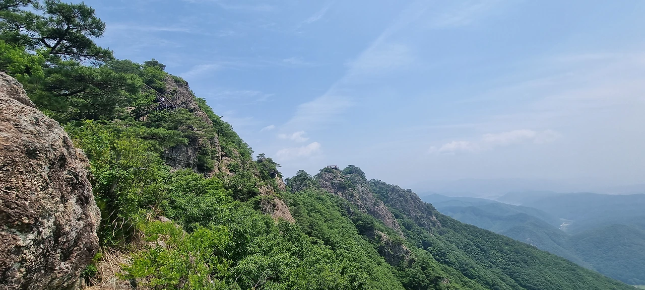 다시 정상 등산로에 접어든다. 앞세웠던 산객들이 휴식터에서 다리와 폐에 휴식을 주고 있다. 정상가는 길을 설명하는데 모두가 힘차게 다시 오르기 시작한다. 산행기를 보면 이곳을 오르는 것이 어렵다고 기록되어 있다. 힘들고 힘들며 욕도 나온다고 쓰여있는 것도 보았다. 암릉을 우회하면서 돌아가는 것인 만큼 쉽지 않은 것은 현실이다. 전망대가 있다. 전망대에 도착하면서 정상에 도착하였다고 착각하고 돌아본다. 우리가 올라온 길이 공룡의 등과 같다. 멋진 능선이다. 슬쩍 오르면 될 것 같은데 그렇지도 않다. 20분을 더 올라야 한다.