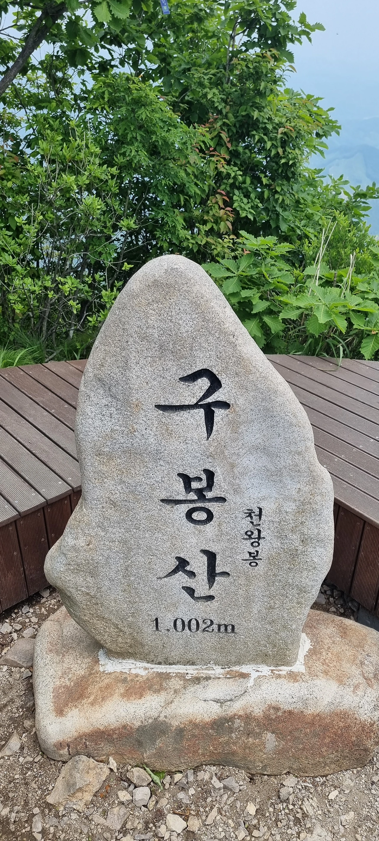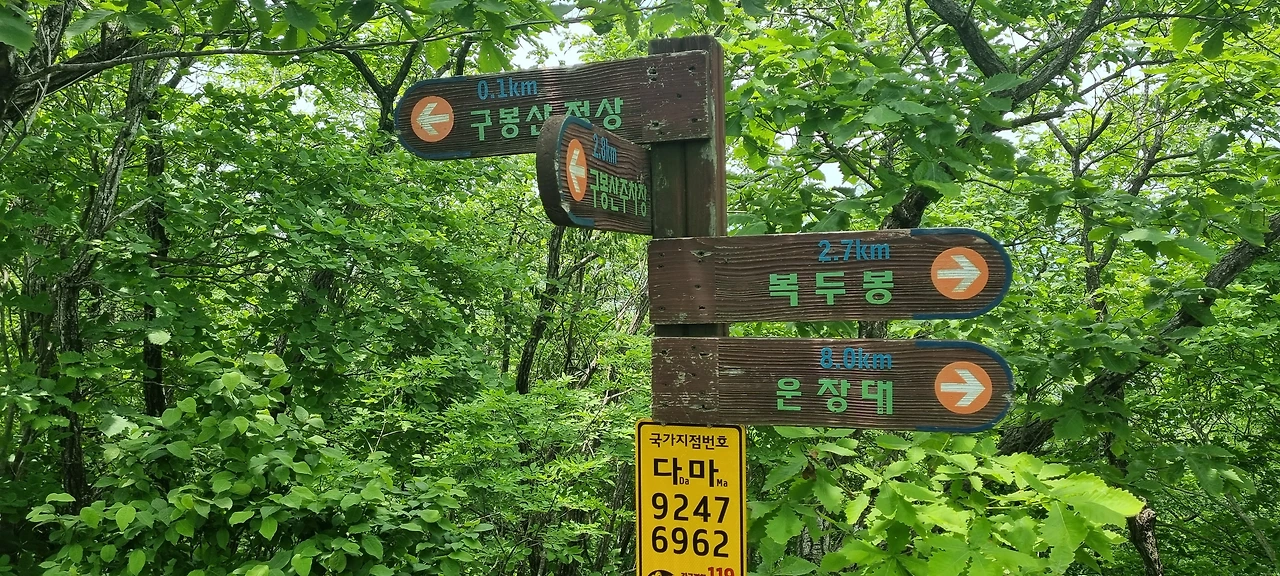 이제 마지막으로 올라가는 데크다. 산을 오르면서 전망도 볼 수 있고 이제 정상이 바로 앞이다. 운장산을 가는 갈림길이다. 산악회에서 운영하는 산행 버스를 보면 1일 2 산을 할 때 운장산 구봉산 이렇게 하는 것을 보았다. 이것이 가능할 수도 있겠다. 너무 무리하지 않기를 바랄 뿐이다. 100m라고 정상표시가 되어 있는데 50m도 되지 않아 정상이다. 여기까지 오른 것이 아쉬운 사람들은 운장대까지 가기도 하고 북두봉을 갔다 오기도 한다.