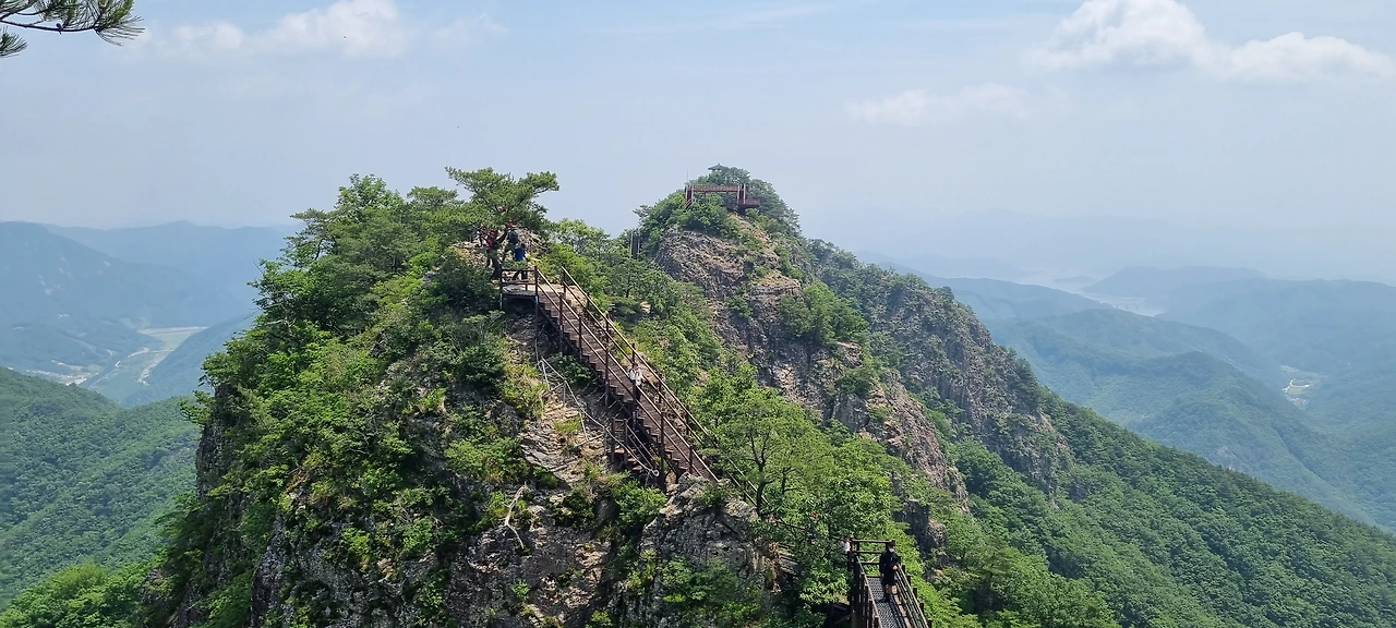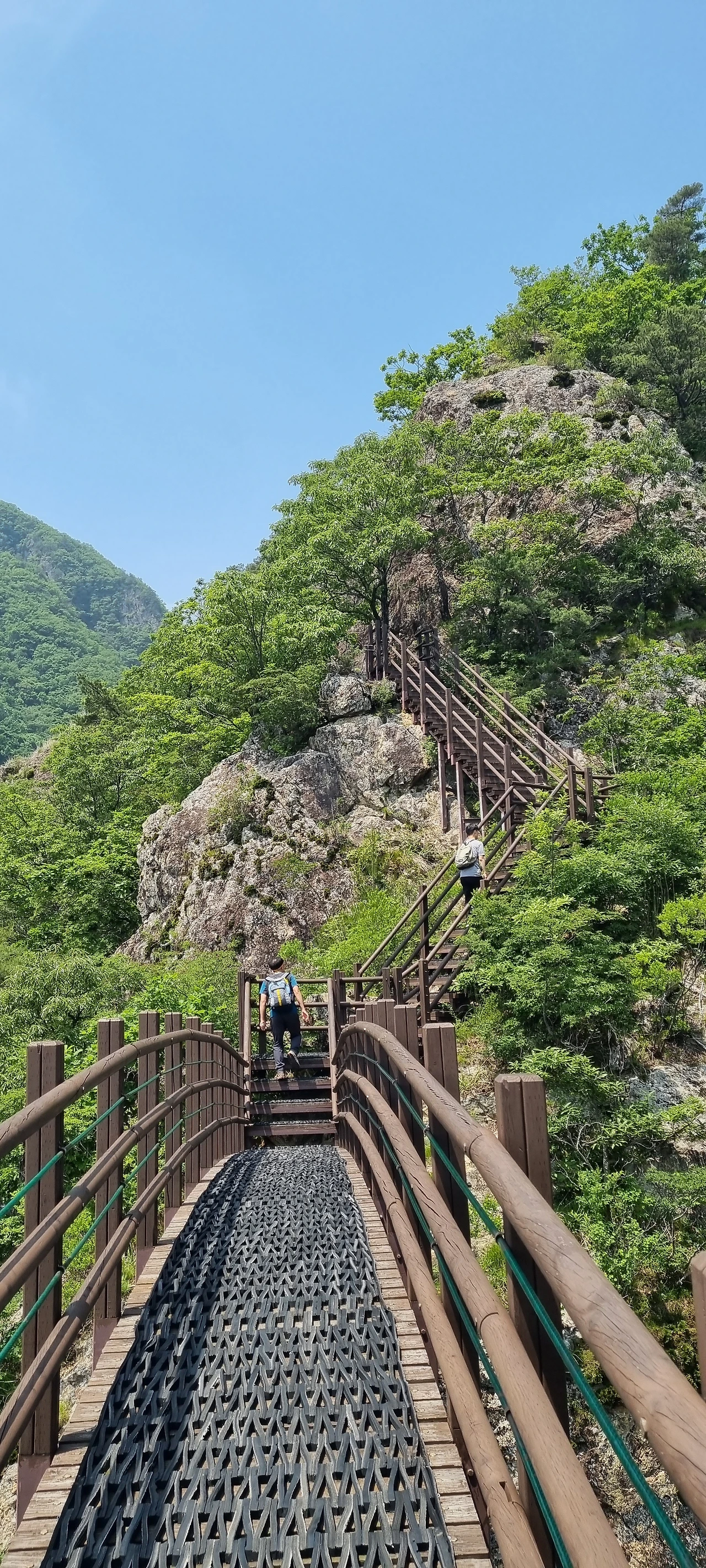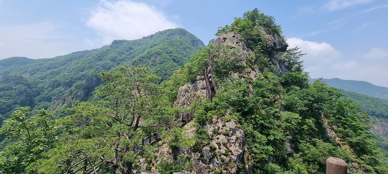 4봉을 지나고 5봉을 구름다리를 건너면 바로 5봉이다. 구름다리가 만들어지기 전에는 5봉을 가기 위하여는 험난한 일정이었으나 이제는 다리만 건너면 된다. 문명의 시대에 우리는 이를 이용할 뿐이다. 이것을 반대하는 사람도 있었을 것이다. 그래도 명품이 되었다. 중국은 잔도를 건설하지만 우리는 데크를 만들고 구름다리를 만든다. 5봉을 내려오면서 우리가 갈길을 보니 산에 데크가 롤러코스터 레일같이 설치되어 있다. 저곳을 레일을 설치하고 오르내리는 산악기차가 다니면 어떨까 생각해본다. 아니면 모노레일이 다니면 명품이 될 수 있지 않을까 생각해본다. 하지만, 즐기자 이곳은 산을 그대로 두어야 할 것 같다.