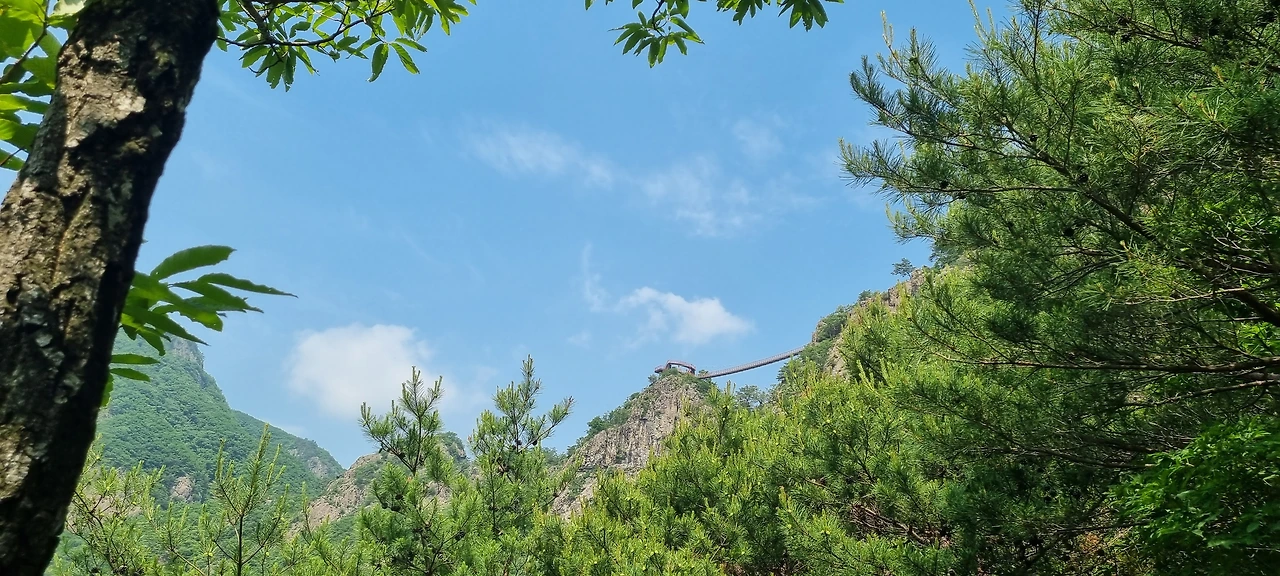 4봉과 5봉 사이에 구름다리가 있다. 거리는 100m 정도다. 그런데 이것이 높은 산 위에 정상과 정상을 연결하고 밑을 내려다보면 오금이 저린다. 대부분이 앞만 보고 지나가면서 슬쩍슬쩍 내려다본다 그리고 구름다리 정면을 볼 뿐이다. 이곳의 구름다리가 2015년 만들어졌으니 경북 봉화의 하늘다리, 대둔산의 구름다리 다음에 만들어진 명물이 되었다고 보아야 할 것이다.