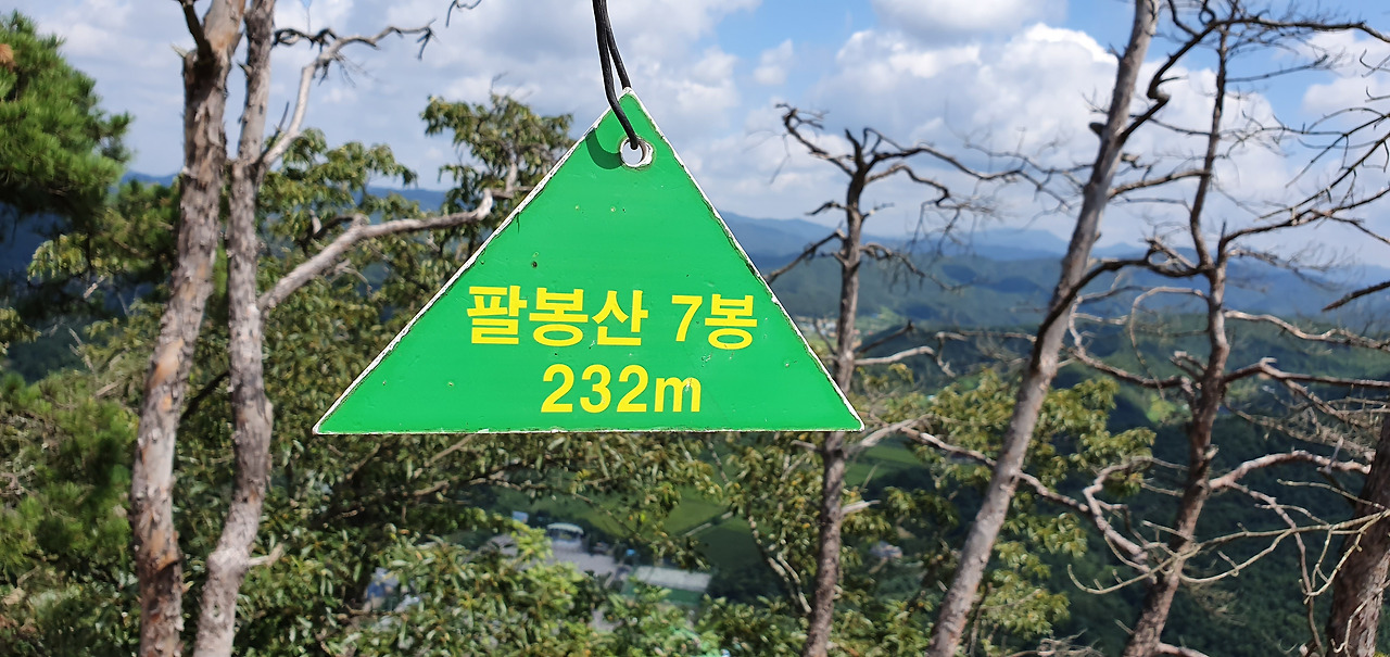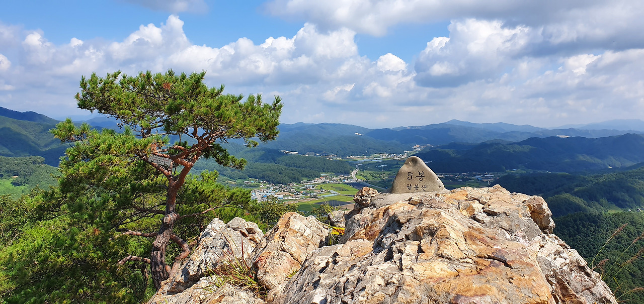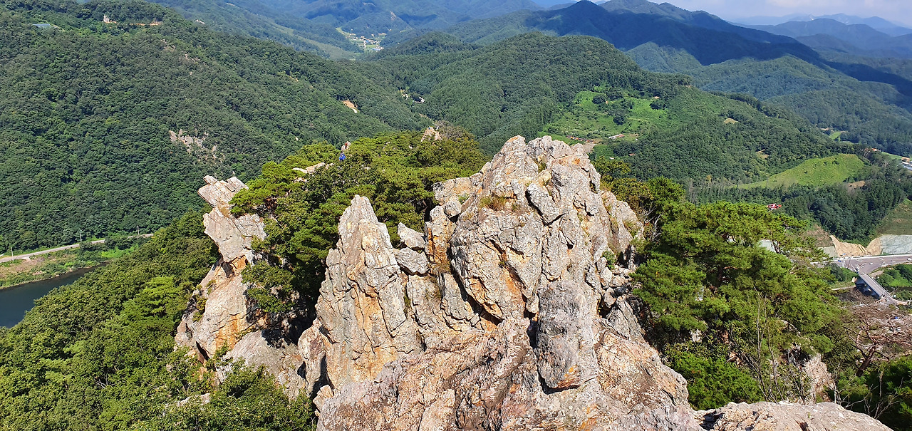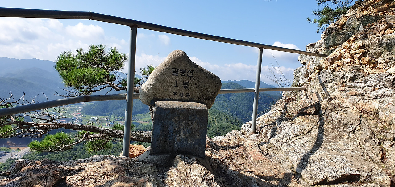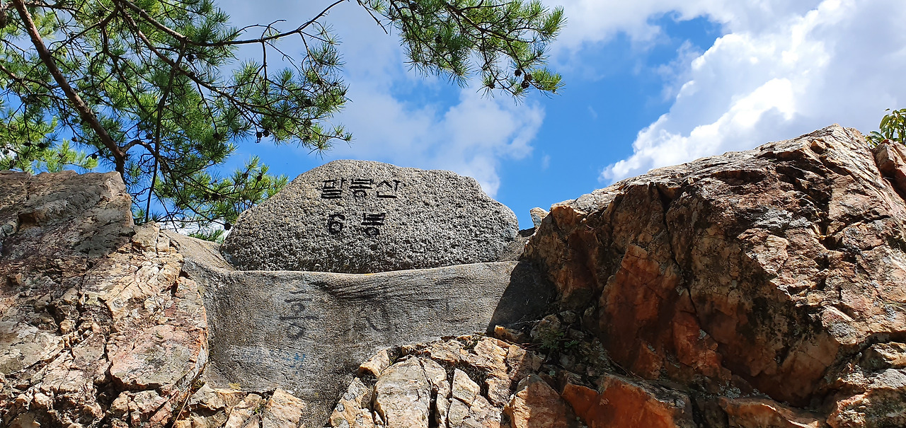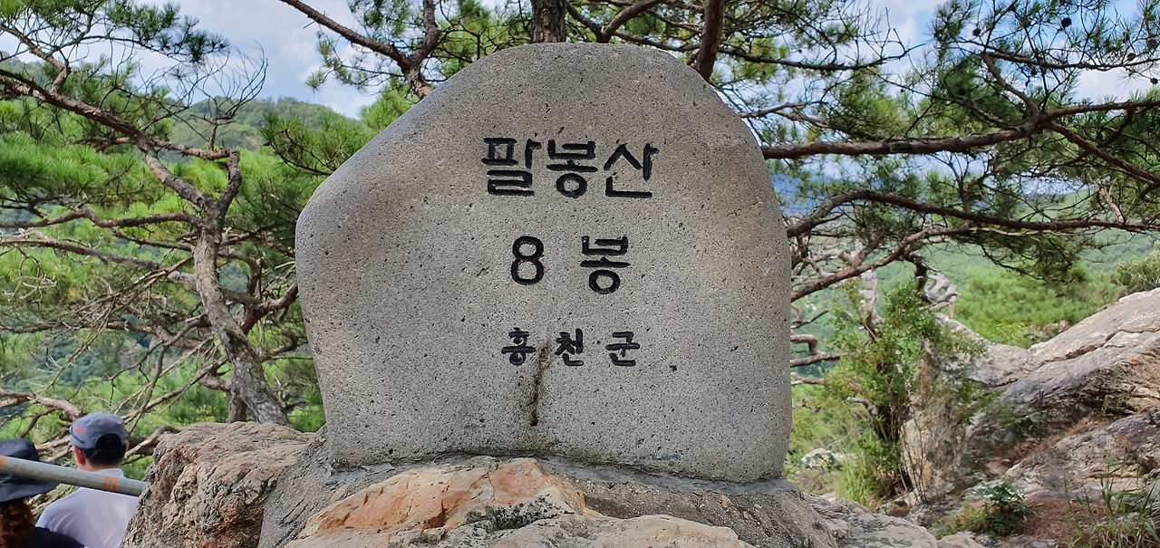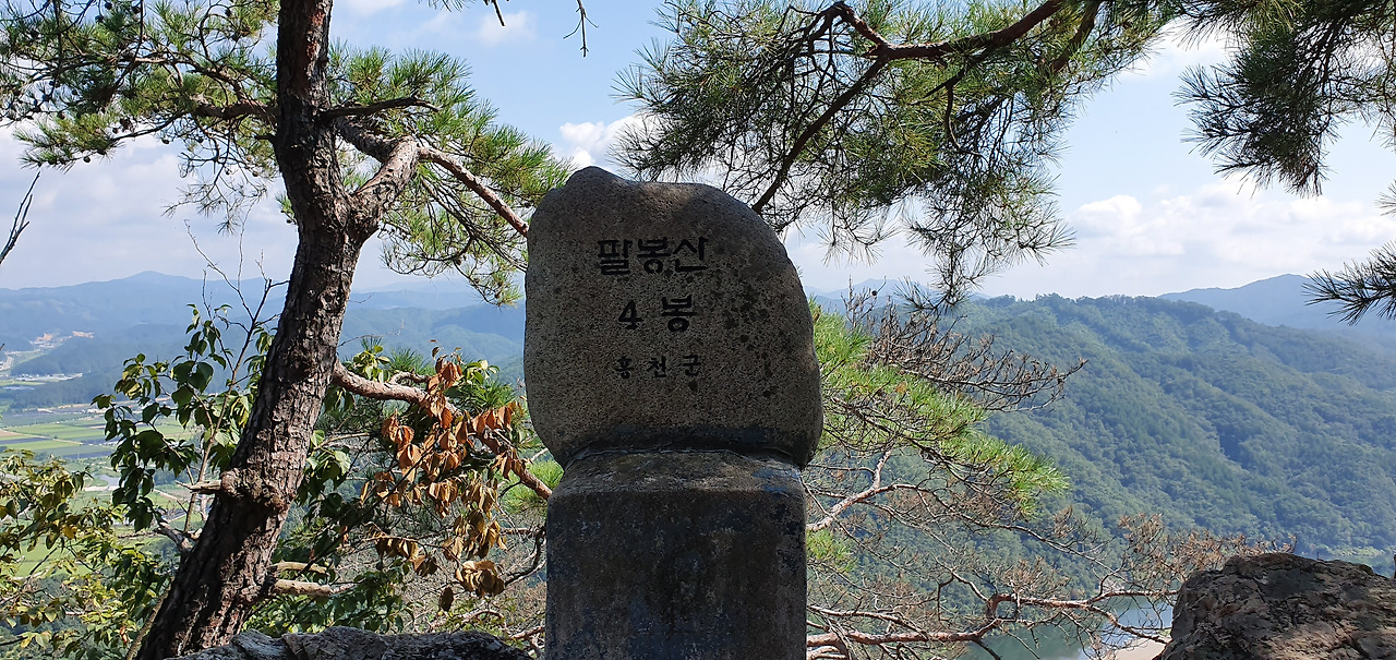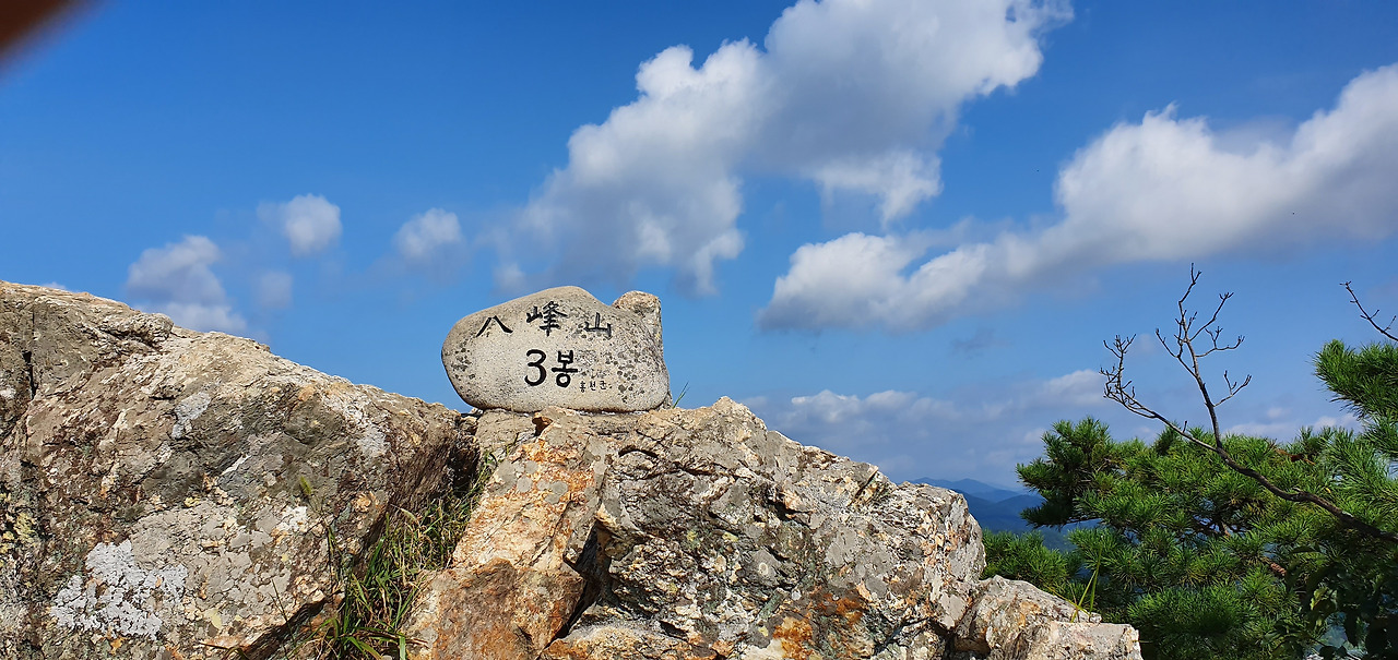3봉에 오르고 살짝 옆으로 돌아 암릉을 돌아본다. 능선이 병풍처럼 펼쳐져있다. 7봉까지는 능선을 타고 조금만 오르내리면 된다. 8봉은 약간 떨어져서 올라야 하기 때문에 보이지 않는다. 표지석은 조그마한 상태로 유지된다. 흙산은 다니기에는 편하다. 하지만 주변을 둘러볼 수 없지만 돌산은 다니기에는 힘들다. 하지만 주변을 둘러볼 수 있다. 적당한 그늘과 바람이 있다면 돌산을 선호하기도 한다. 아직 8월인데 하늘의 구름은 가을이 성큼 다가왔음을 보여준다. 3봉 정상을 배경으로 홍천을 담는다. 홍천강과 주변의 집들 산이 어우러져 있다.
