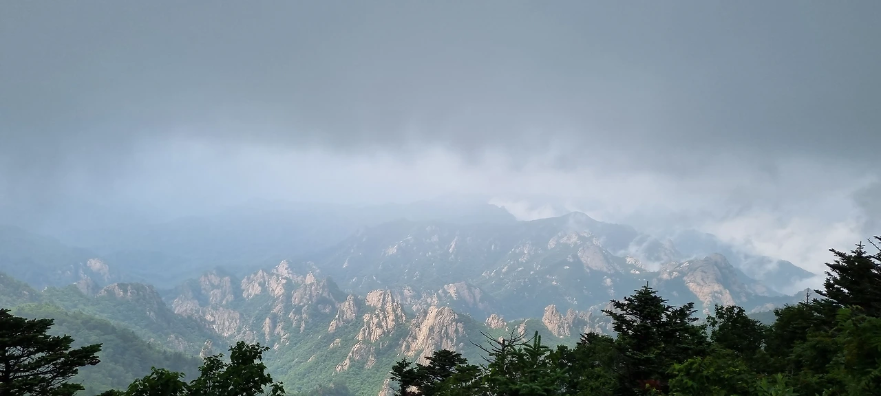 하얀 구름이 능선을 넘는 모습에 공룡 능선의 뿔들이 하늘을 향해 솟아 있다. 왼쪽으로 넘어오는 흰 구름을 이제 검은 비구름이 덮치고 있다. 이제 비가 가까이 오고 있다.