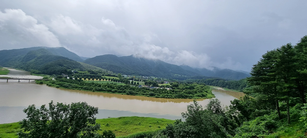 화양강 휴게소에서 가쁜 숨을 쉬고 온 버스도 20분 쉰다. 오늘 비가 온 관계로 어려움이 예상된다. 그래도 재마는 있을 것이다. 화양강휴게소에서 휴식하면서 건너편을 본다. 물이 휘감아 나가고 있으며 동네는 강을 그냥 쳐다보고 있다, 그렇게 비가 왔는데 위도가 38도선 가까이 올라오니 비도 그치고 햇빛이 쨍쨍이다. 비구름이 서울을 기준으로 옆으로 이동한 것 같다. 설악산은 지금 새벽에 비를 뿌렸던 구름이 걸려있다.