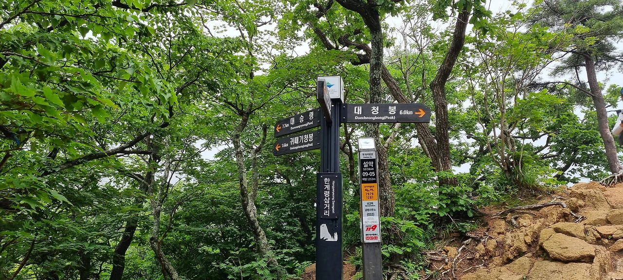 귀때기청봉이 보이는 봉우리까지 올라서면 한차례 고비를 넘는다. 올랐으나 구름이 완벽하게 귀때기청봉을 숨겼다. 그냥 걸어야 한다. 이제는 야생화나 사진에 담아야겠다. 하면서 한계삼거리까지 간다. 같은 버스를 타고 온 분이 귀때기청봉을 거쳐 장수대까지 간다고 한다. 잘 걷는다. 1시간이 안되어 한계삼거리를 오르는 데크를 우리는 만났다. 서로의 건투를 빌면서 헤어진다. 7시간 40분이 장수대까지 이며 오색까지 7시간이다. 대승령 폭포가 예술적일 것이다. 폭포가 여름 비로 인하여 그대로 장관을 이룰 것이다.