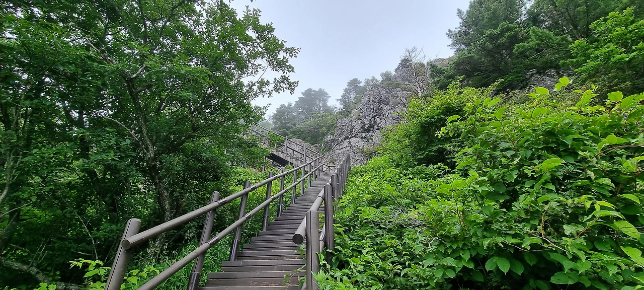 이른 아침 산행 대열에 끼여서 거의 걸었던 길은 밤의 어두움 속에서 아무것도 볼 수 없었으나 오늘은 구름 속에서 멀리는 보이지 않지만 내 주변은 볼 수 있다.