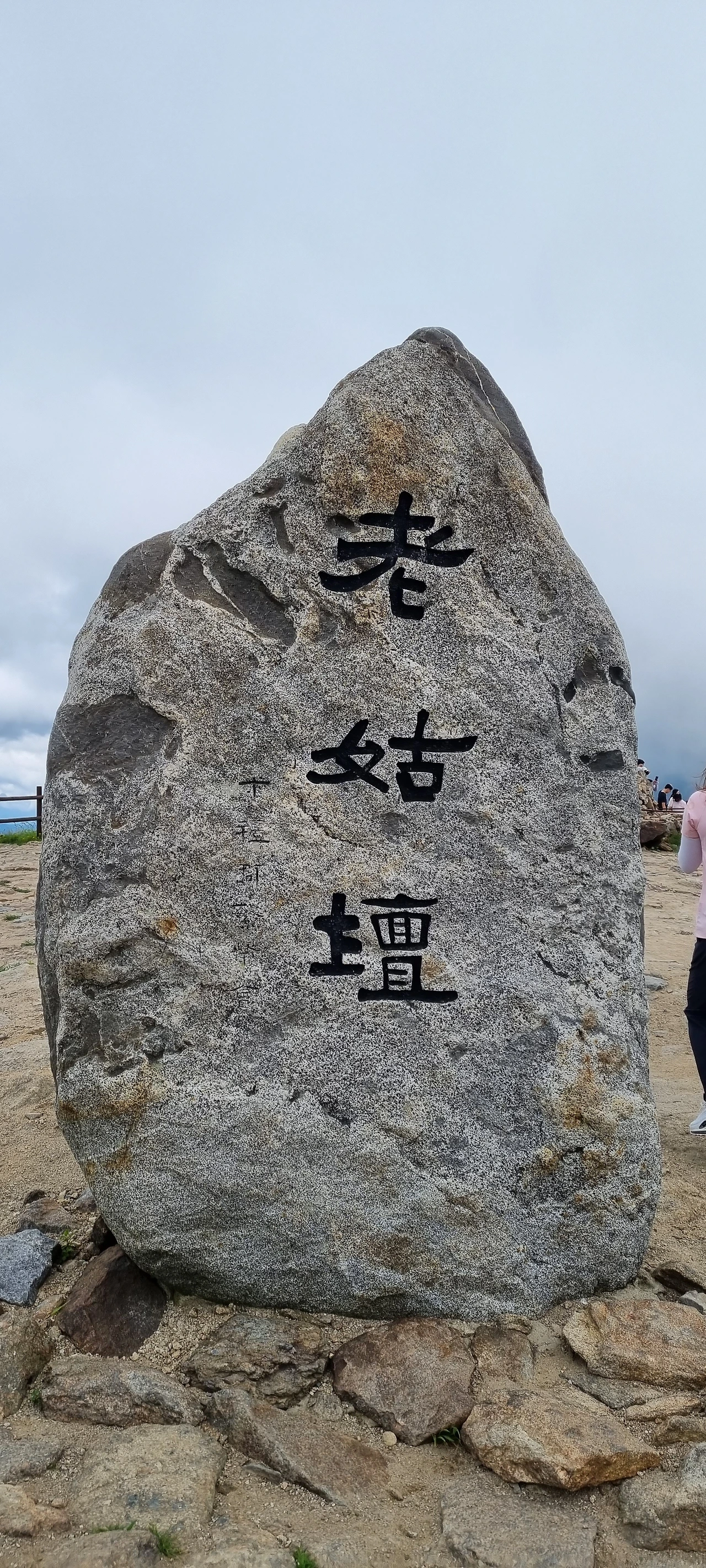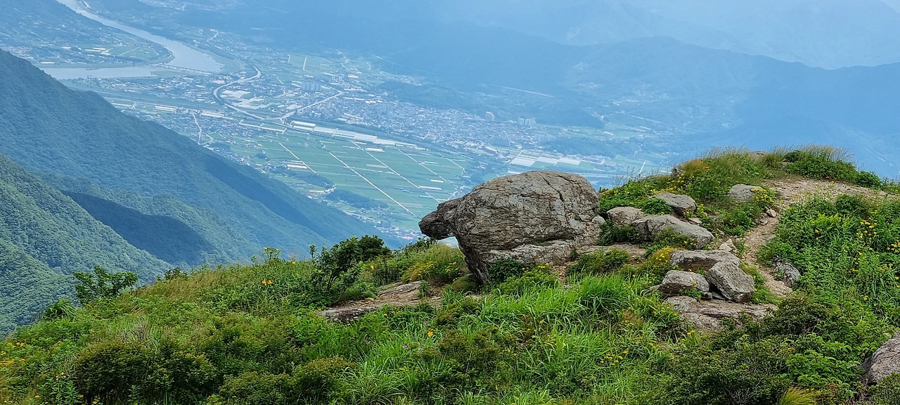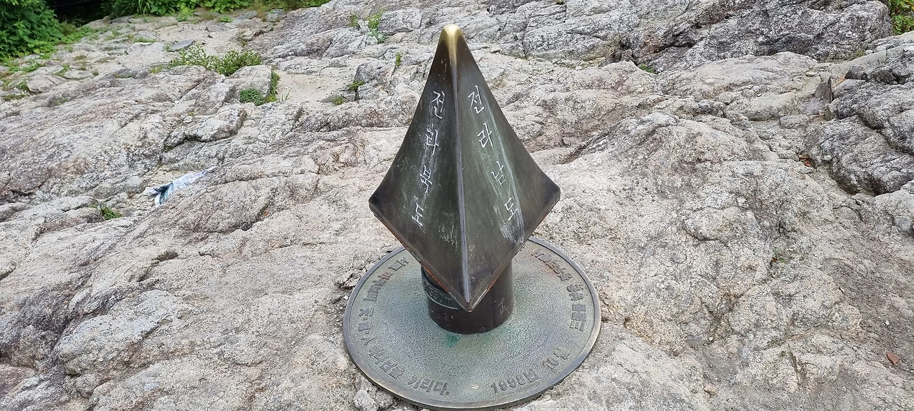 노고단 정상석에서 구례를 내려다보니 섬진강이 구례를 지나가고 있다. 거북바위가 아래를 내려다보고 있다. 노고단에서 심신을 수련한 이유를 알 것 같다. 지리산의 천왕봉과 반야봉을 볼 수 있고 섬진강도 아래로 내려다볼 수 있다. 반야봉은 아직도 구름에 싸여 있다.