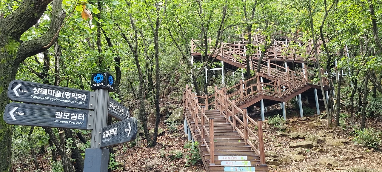 군포와 안양의 갈림길이 시작되는 지점부터 이제는 가파름의 최고봉이다. 이곳이 관모 쉼터다. 예전에 이곳에 왔을 때 한창 공사 중이었는데 이제는 공사가 완료되어 데크를 이용하여 올라갈 수 있다.
