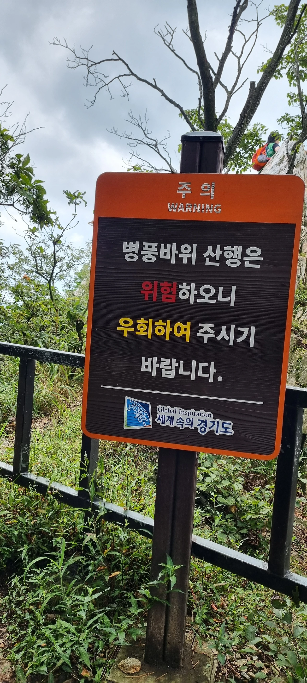 태을봉에 올라보면 헬기장이 있고 이곳은 군포라는 것을 표시하고 있다. 관모봉은 안양시, 태을봉은 군포시다. 군포시에서 정상석을 세워 놓았다. 이제는 슬기봉으로 간다. 태을봉을 내려오자마자 병풍바위다. 병풍바위 능선을 그대로 등산하는 것은 위험하니 우회하라고 알림 표시가 있다. 나도 예전에 이 병풍바위를 넘어 보았지만 위험하기 그지없다. 병풍 방위에 앉아서 점심을 먹는 사람들도 있다. 그 바위를 지나는 사람이 없기에 점심을 먹는 사람들이 편안하게 식사를 하고 있다.