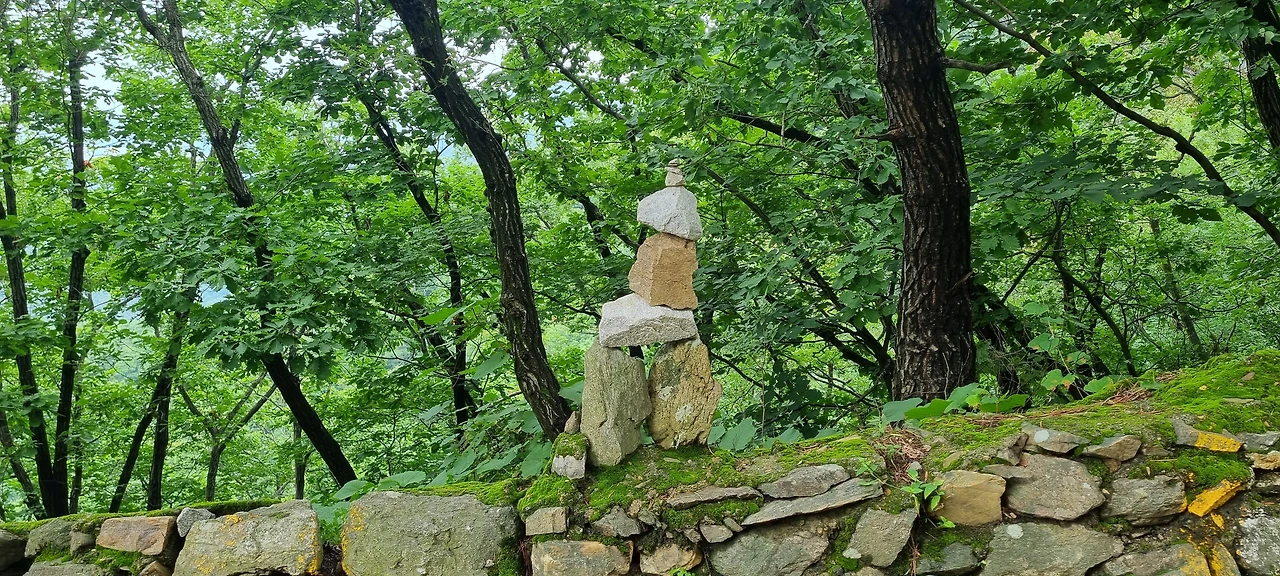 수암봉 가는 길에서 왼쪽은 군부대 오른쪽은 수암봉으로 가는 길이다. 포장도로를 2-300M 내려간 후 수리사 가는 길과 수암봉 가는 길로 접어든다. 포장된 도로에 접어들자마자 이채로운 돌탑이 눈길을 끈다. 오랫동안 비바람에 시달렸으면서 그 형태를 유지하여 이제는 탑의 기단 부분에 이끼도 끼어 있다. 저 탑을 세운 사람이 이곳을 몇 번 왔다 갔는지 모르겠다.