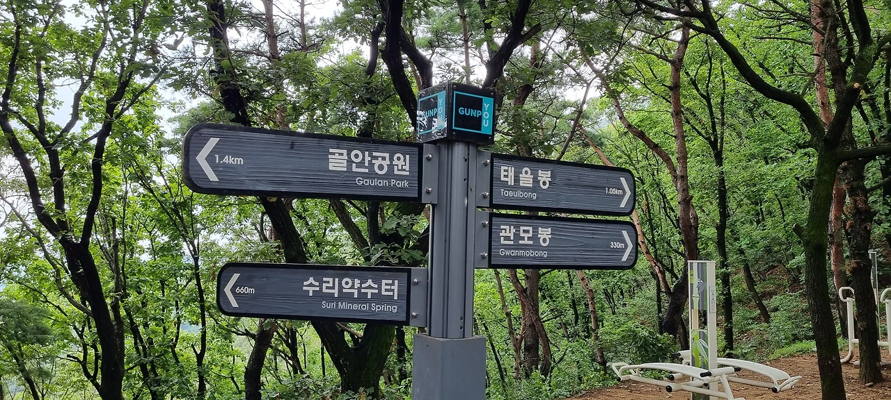 군포의 산림욕장과 임도오거리에서 올라오는 길이 여기에 있다. 임도오거리에서 올라는 사람들은 슬기봉을 힘들게 올라와서 슬기봉을 보기보다는 정상 근처의 수암봉 가는 길만 볼뿐이다.