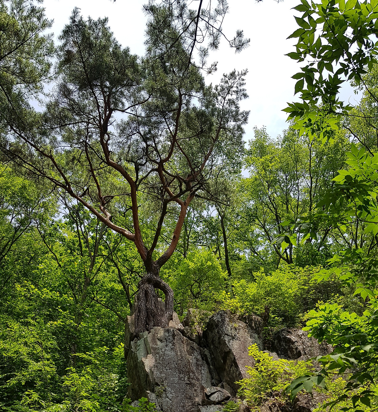 함박등에서 이제는 통도사로 내려간다. 백운암 바로 직전에 재미있는 소나무가 있다. 백운암은 통도사의 12개의 암자 중에 가장 높은 곳에 위치하고 있다. 백운암에서 통도사로 내려가는 길은 소나무가 멋있다.